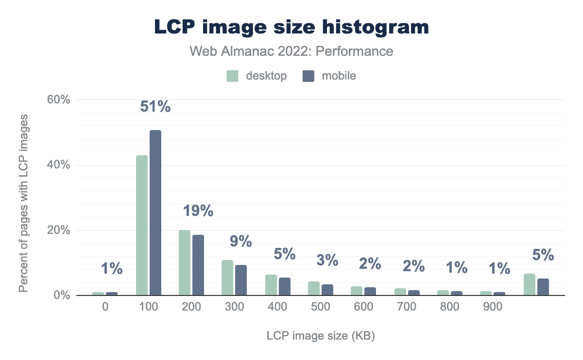 異なる視点から見ると、上記の図は100KB刻みのヒストグラムとして分布を示しています。この視点からは、LCP画像サイズが主に200KB未満の範囲に落ちることがより明確に見えます。また、モバイルのLCP画像の5%が1,000KBを超えるサイズであることがわかります。