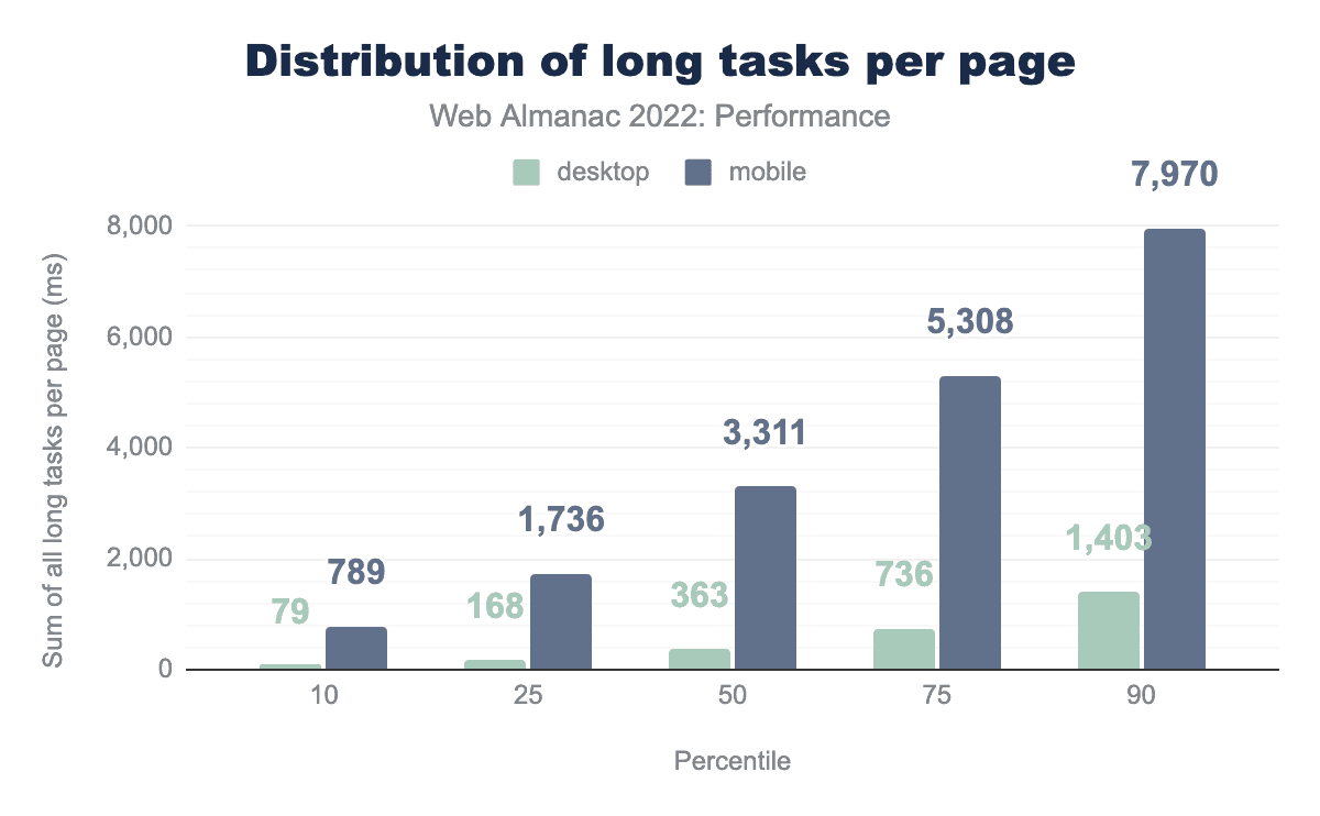 中央値のモバイルウェブページは、長時間タスクで3.3秒分を有していますが、デスクトップページは0.4秒分のみです。再び、これはCPU速度が応答性のヒューリスティックスに大きな影響を与えていることを示しています。90パーセンタイルでは、モバイルページは少なくとも8.0秒の長時間タスクを有しています。