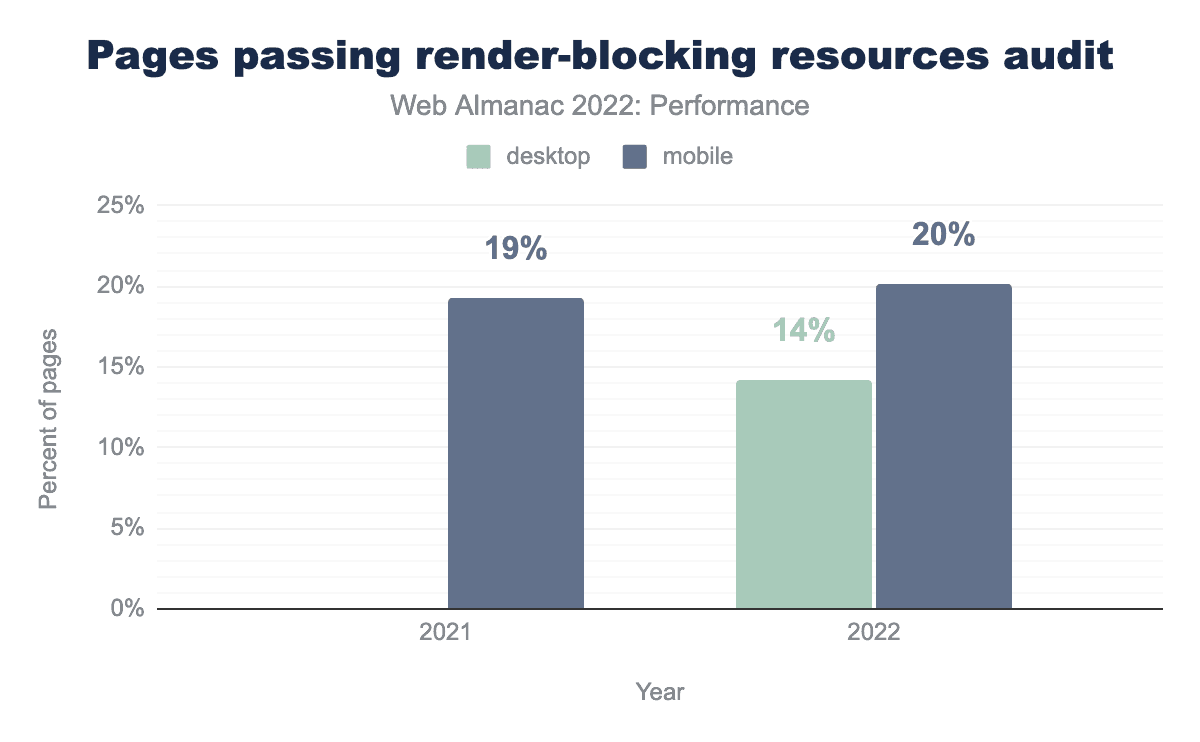 驚くべきことに、レンダリングをブロックするリソースを持つページの割合に劇的な改善はありませんでした。モバイルページのわずか20%が監査に合格しており、これは昨年からわずか1ポイントの増加に過ぎません。