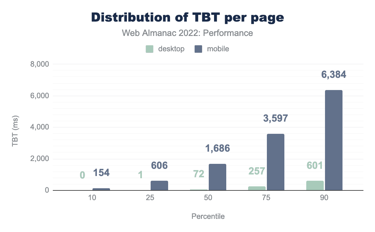 それを念頭に置いて、モバイルページはデスクトップページよりもTBTが著しく悪いことがわかります。これは驚くことではありません。なぜなら、私たちのLighthouseモバイル環境は、低端のモバイルデバイスをエミュレートする方法でCPUを制限するように意図的に設定されているからです。それにもかかわらず、結果は中央値のモバイルページがTBTが1.7秒であることを示しており、これが実際のユーザー体験であれば、FCPから1.7秒以内のタップは反応しないことを意味します。90パーセンタイルでは、ユーザーはページが反応するまで6.3秒待たなければなりません。