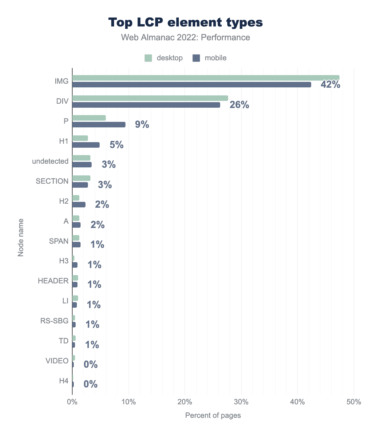 IMGはデスクトップページの47%、モバイルページの42%でLCP要素です。DIVはそれぞれ28%と26%、Pは6%と9%、H1は3%と5%、undetectedは3%と3%、SECTIONは3%と3%、H2は1%と2%、Aは1%と2%、SPANは1%と1%、H3は0%と1%、HEADERは1%と1%、LIは1%と1%、RS-SBGは1%と1%、TDは1%と1%、VIDEOは0%と0%、最後にH4はデスクトップとモバイルの両方のページで0%のLCP要素タイプです。画像はもっとも一般的なLCPコンテンツタイプであり、img要素はモバイルページの42%でLCPを表しています。モバイルページでは、見出しや段落の要素がLCPとなる可能性がデスクトップページよりもわずかに高く、デスクトップページでは画像要素がLCPとなる可能性が高くなっています。1つの可能な説明は、とくに縦向きのモバイルレイアウトでは、レスポンシブでない画像が小さく表示されるため、見出しや段落のような大きなテキストブロックがLCP要素になるというものです。