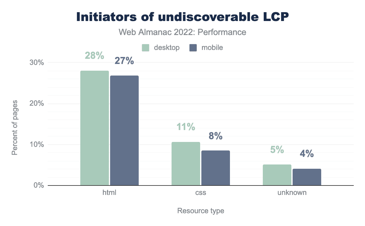 モバイルページの39%が静的に発見可能でないLCP要素を持っています。この数字はデスクトップでは44%のページでさらに悪いです。これは、前のセクションの発見によるものかもしれません。それによると、LCPコンテンツがデスクトップページで画像である可能性が高いです。