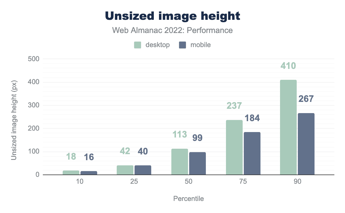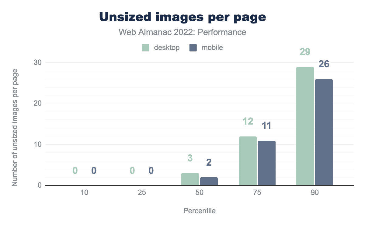 中央値のウェブページには2枚のサイズが指定されていない画像があり、モバイルページの10%には少なくとも26枚のサイズが指定されていない画像があります。