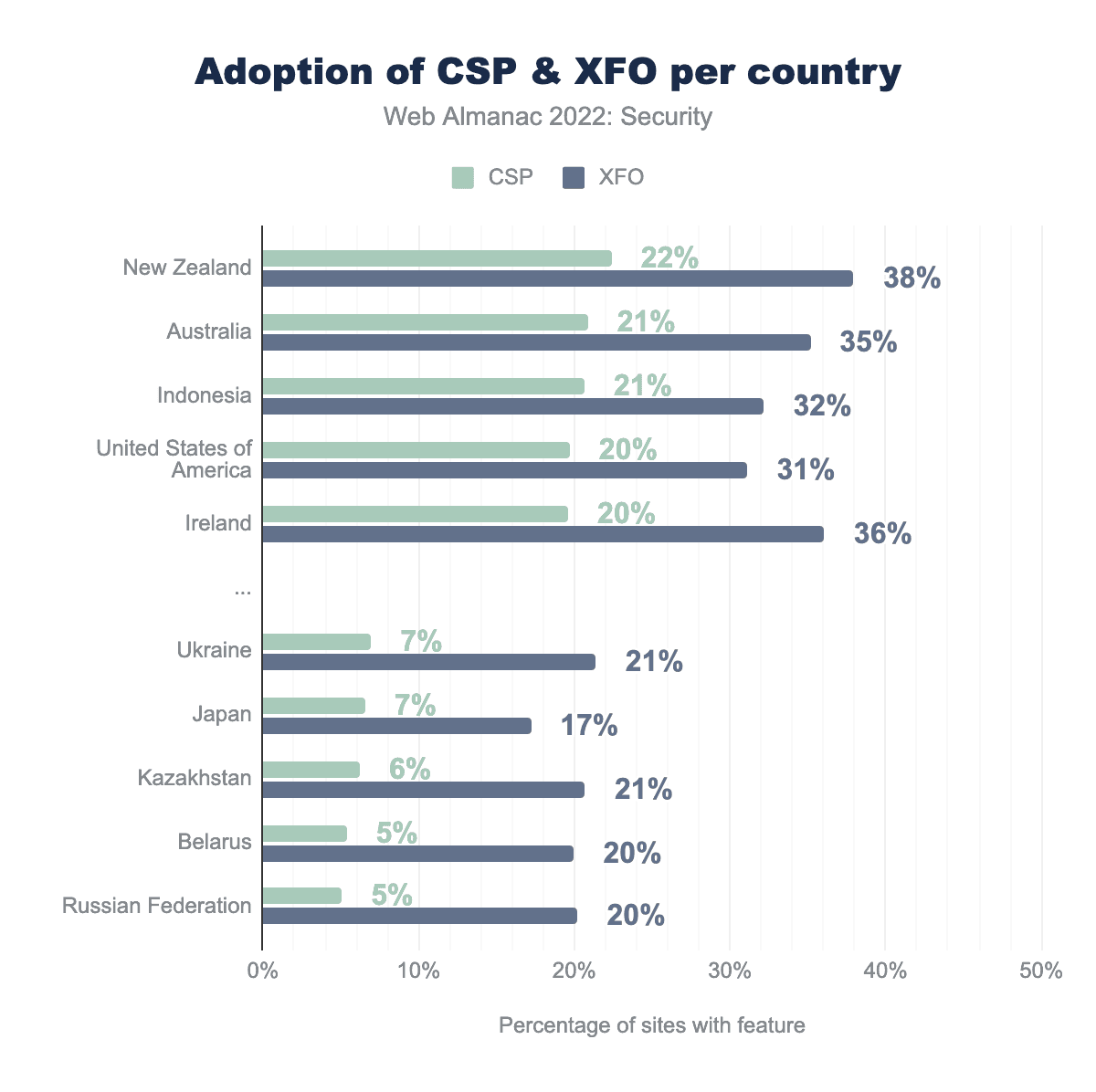 CSPとX-Frame-Options(XFO)の採用は昨年と非常に似ています。驚くべきことに、インドネシアのウェブサイトはCSPの採用が非常に進んでいますが、HTTPSの採用は依然として低いままです。CSPの採用は国によって非常にバラバラですが、XFOの採用差は徐々に縮小しています。CSPは多岐にわたる攻撃から保護する非常に重要なセキュリティ機能であるため、より多くの国がCSPの採用を増やす必要があります。