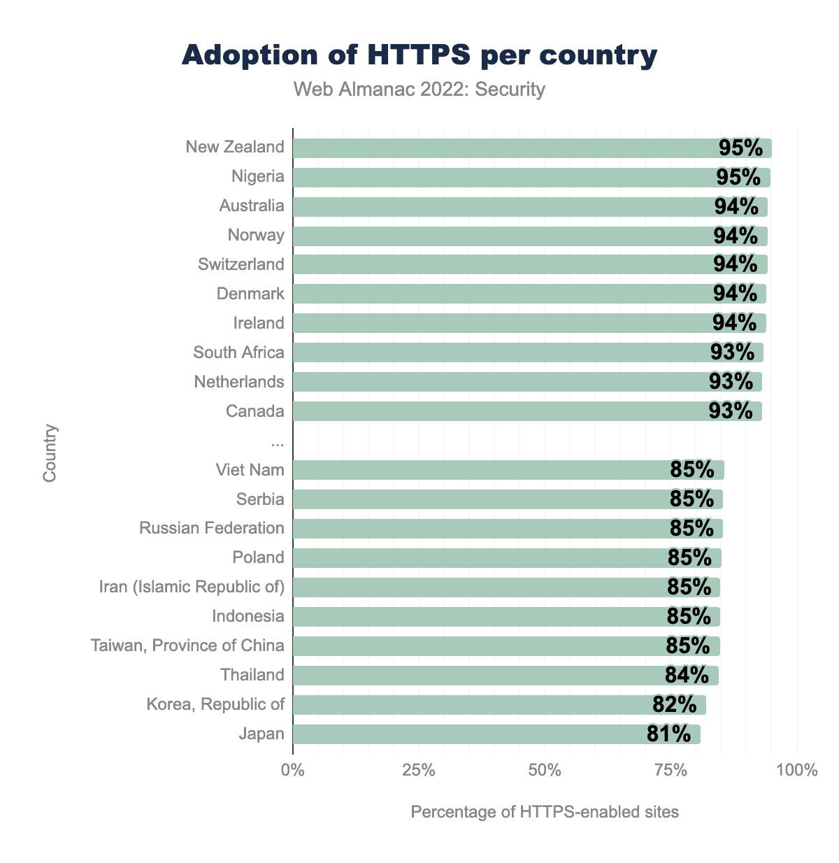 ニュージーランド、ノルウェー、デンマークなどの新しい国々がHTTPSの採用で急速にトップに上り詰めています。新しい国々も広範なセキュリティ対策を採用しているのを見るのは良い兆候です。また、HTTPSの最低採用率と最高採用率の差が縮小していることから、ほぼすべての国がデフォルトでウェブサイトにHTTPSを有していることを目指していることがわかります。
