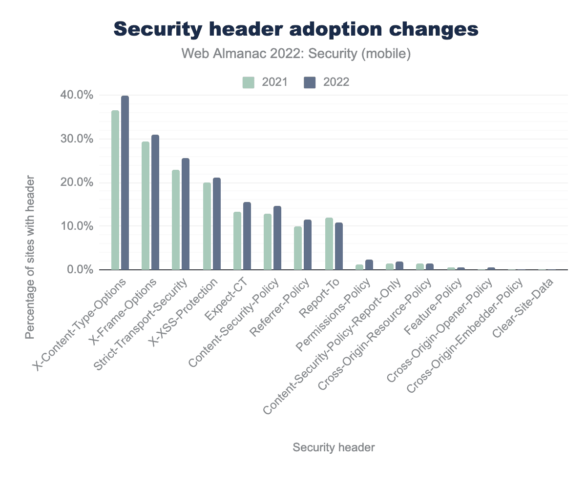 2021年のデータの12.8%から2022年のデータの14.6%へと、Content-Security-Policyヘッダーの採用率が14%相対的に増加しています。これは開発者とウェブセキュリティコミュニティの間で採用傾向が高まっていることを示しています。これはポジティブな兆候ですが、依然としてこのより高度な機能を使用しているサイトは少数派です。