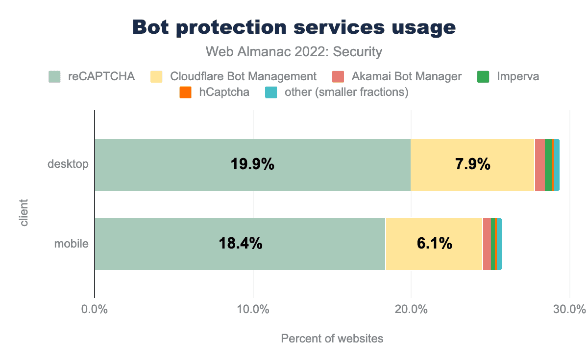 分析によると、デスクトップのウェブサイトの29%、モバイルのウェブサイトの26%が悪質なボットと戦うためのメカニズムを使用しており、昨年(それぞれ11%と10%)から大幅に増加しています。この増加はCloudflareボット管理などのキャプチャフリーのソリューションが原因かもしれません。昨年のデータクロールではこの点が追跡されていませんでしたが、今年はそれが識別され、モバイルのウェブサイトの6%で使用されていることがわかりました。デスクトップとモバイルの両方でreCaptchaの使用も昨年から約9%増加しています。