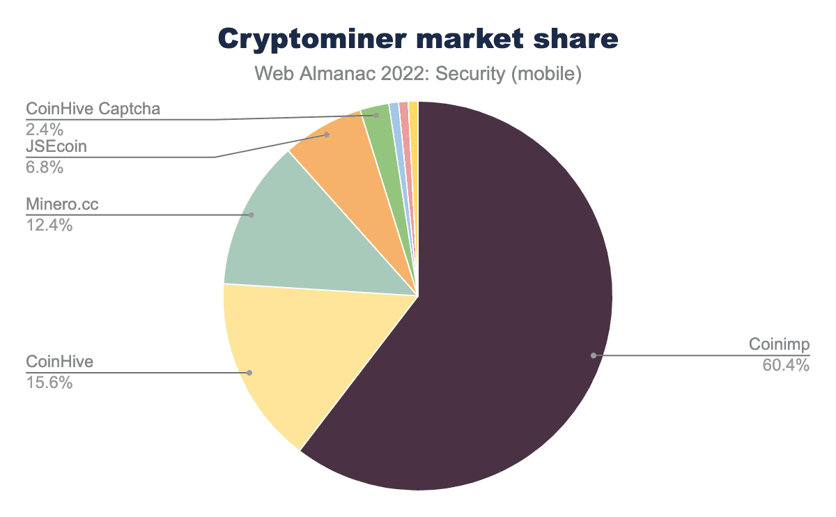 デスクトップとモバイルのウェブサイトで使用されている暗号通貨マイナーの具体的な情報を見ると、マイナー間のシェアが昨年から広がっています。たとえば、Coinimpのシェアは昨年から約24%縮小し、Minero.ccは約11%増加しました。
