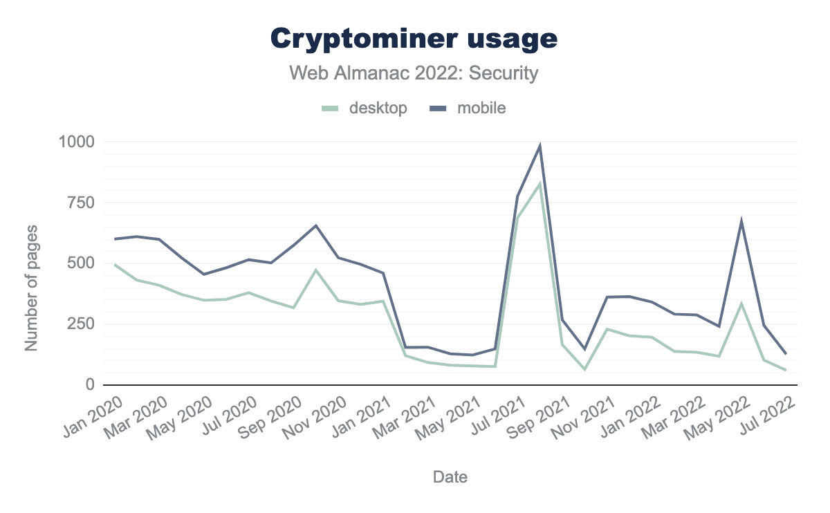 例として、2021年の7月と8月には、いくつかの暗号通貨ジャッキングキャンペーンと脆弱性が報告され、その時期にウェブサイトで見つかった暗号通貨マイナーの急増が発生しました。さらに最近の2022年4月には、ハッカーがSpringShell脆弱性を利用して暗号通貨マイナーを設定し実行しようと試みました。