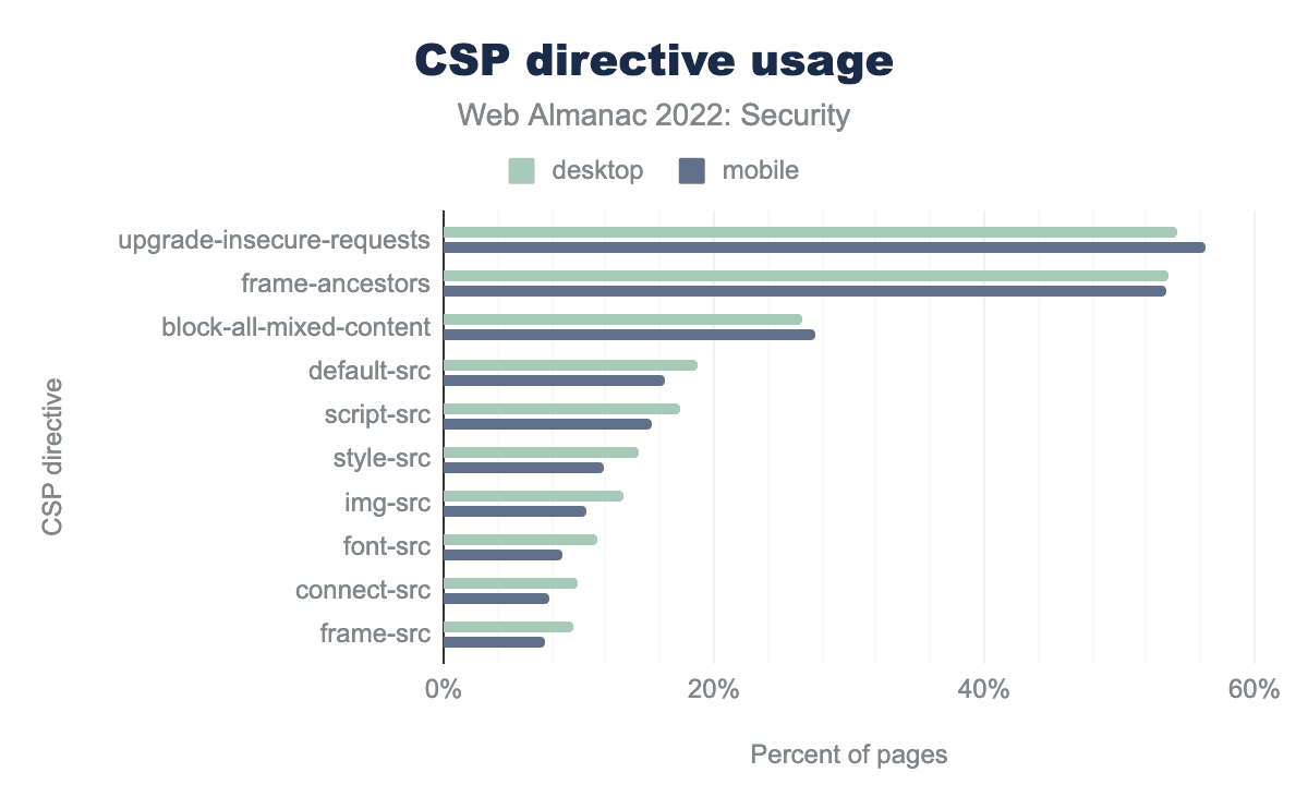 upgrade-insecure-requestsがデスクトップで54%、モバイルで56%ともっとも一般的であり、次にframe-ancestorsがデスクトップで54%、モバイルで53%です。block-all-mixed-contentはデスクトップで26%、モバイルで38%、default-srcはデスクトップで19%、モバイルで16%、script-srcはデスクトップで17%、モバイルで15%、style-srcはデスクトップで14%、モバイルで12%、img-srcはデスクトップで13%、モバイルで11%、font-srcはデスクトップで11%、モバイルで9%、connect-srcはデスクトップで10%、モバイルで8%、frame-srcはデスクトップで10%、モバイルで7%です。デスクトップとモバイルのHTTPリクエストの四分の一以上で提供されている上位3つのCSPディレクティブは、upgrade-insecure-requestsが54%、frame-ancestorsが54%、block-all-mixed-contentポリシーが27%です。その他のポリシーにはdefault-src、script-src、style-src、img-srcなどがあります。