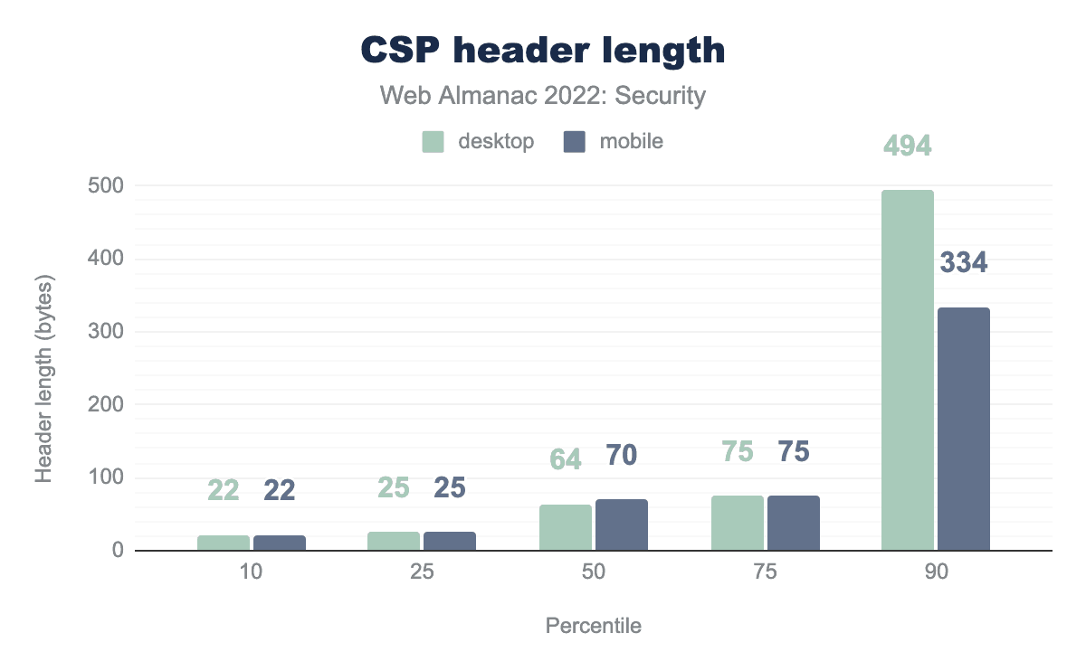 中央値で見ると、リクエストの50%がデスクトップで70バイトのサイズです。これは昨年のレポートからわずかに減少しており、昨年はデスクトップとモバイルのリクエストが75バイトでした。90番目のパーセンタイル以上のリクエストは、昨年のデスクトップリクエストの389バイトから、今年は494バイトに増加しています。これは、より複雑で完全なセキュリティポリシーへのわずかな進歩を示しています。