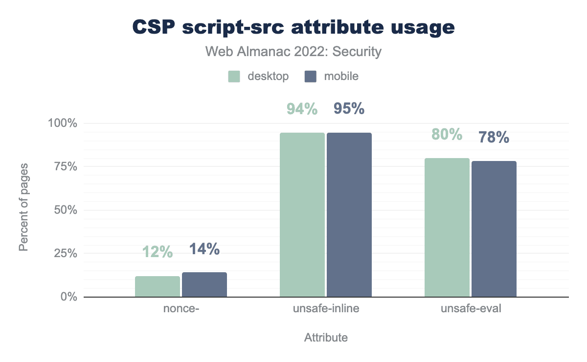 デスクトップのHTTPリクエストの統計によると、script-src 値の94%で unsafe-inline、80%で unsafe-eval が存在します。これは、ウェブサイトのアプリケーションコードをロックダウンし、インラインJavaScriptコードを避けることの実際の課題を示しています。さらに、上述のリクエストのうち14%だけが、安全でないインラインJavaScriptコードの使用を保護するのに役立つ nonce- ディレクティブを採用しています。