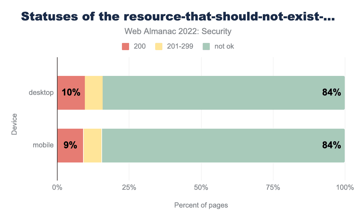 resource-that-should-not-exist-whose-status-code-should-not-be-200エンドポイントによる応答ステータスを示す棒グラフ。デスクトップのウェブサイトの10%が200を返し、84%がnot-okステータスを返し、6%が201-299のステータスコードを返します。モバイルのウェブサイトでは、9%が200を返し、84%がnot-okステータスを返し、7%が201-299のステータスコードを返します。このよく知られたURIに対して、モバイルとデスクトップのウェブサイトの84%がnot-okステータスで応答しています。この仕様の良い点は、ウェブサイトが正しく設定されていれば、ウェブサイト開発者が特定の変更を行う必要がなく、自動的に機能することです。