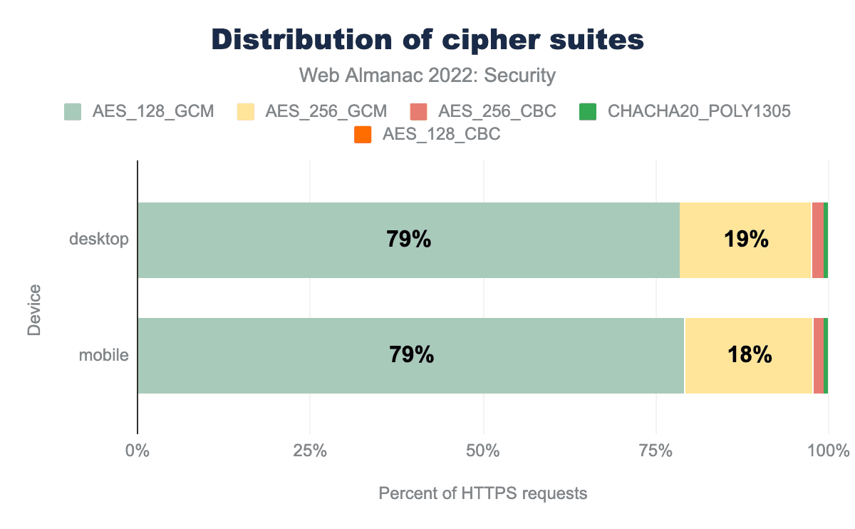 AES_128_GCMがもっとも一般的で、デスクトップとモバイルサイトの79%で使用されています。AES_256_GCMはデスクトップの19%、モバイルの18%で使用されています。AES_256_CBCはデスクトップの2%、モバイルの1%で使用されています。CHACHA20_POLY1305はそれぞれのサイトで1%と1%で使用されています。AES_128_CBCはそれぞれ0%と0%で使用されています。現代のGalois/Counter Mode (GCM)暗号モードは、パディング攻撃に弱くないため、はるかに安全とされています。TLS v1.3はモダンなブロック暗号モードのみをサポートしており、より安全です。また、暗号スイートの順序付けの問題も解消しています。暗号と復号に使用される鍵のサイズも暗号スイートの使用を決定する要因の1つです。依然として128ビット鍵サイズが広く使用されているため、昨年のグラフと大きな違いは見られません。AES_128_GCMが依然としてもっとも使用されている暗号スイートで、使用率は79%です。