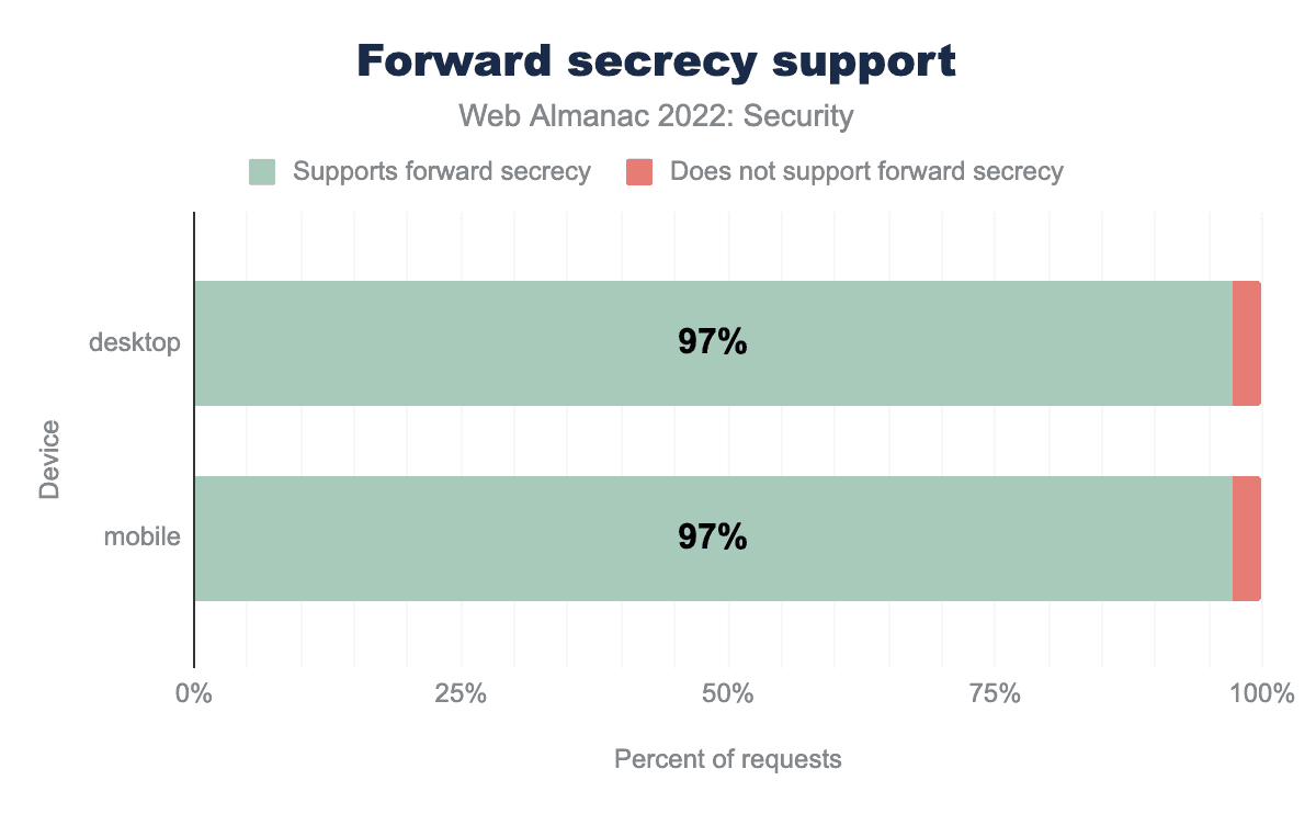 TLS v1.3は、フォワードシークレシーを義務付けています。モバイルとデスクトップのリクエストの97%でフォワードシークレシーが使用されています。