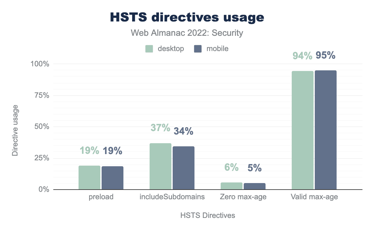 モバイルのリクエストレスポンスの34%とデスクトップの37%がHSTS設定にincludeSubdomainを含んでいます。HSTS仕様の一部ではないpreloadディレクティブを含むレスポンスは少なく、少なくとも31,536,000秒(または1年)のmax-ageとincludeSubdomainディレクティブの存在が必要です。