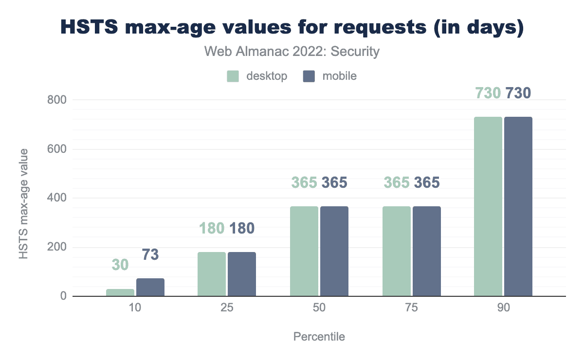 HSTSヘッダーのmax-age属性のすべてのリクエストに対する中央値は、モバイルとデスクトップの両方で365日です。hstspreload.orgは、HSTSヘッダーが適切に設定されて問題がないことが確認された場合、max-ageを2年間に設定することを推奨しています。