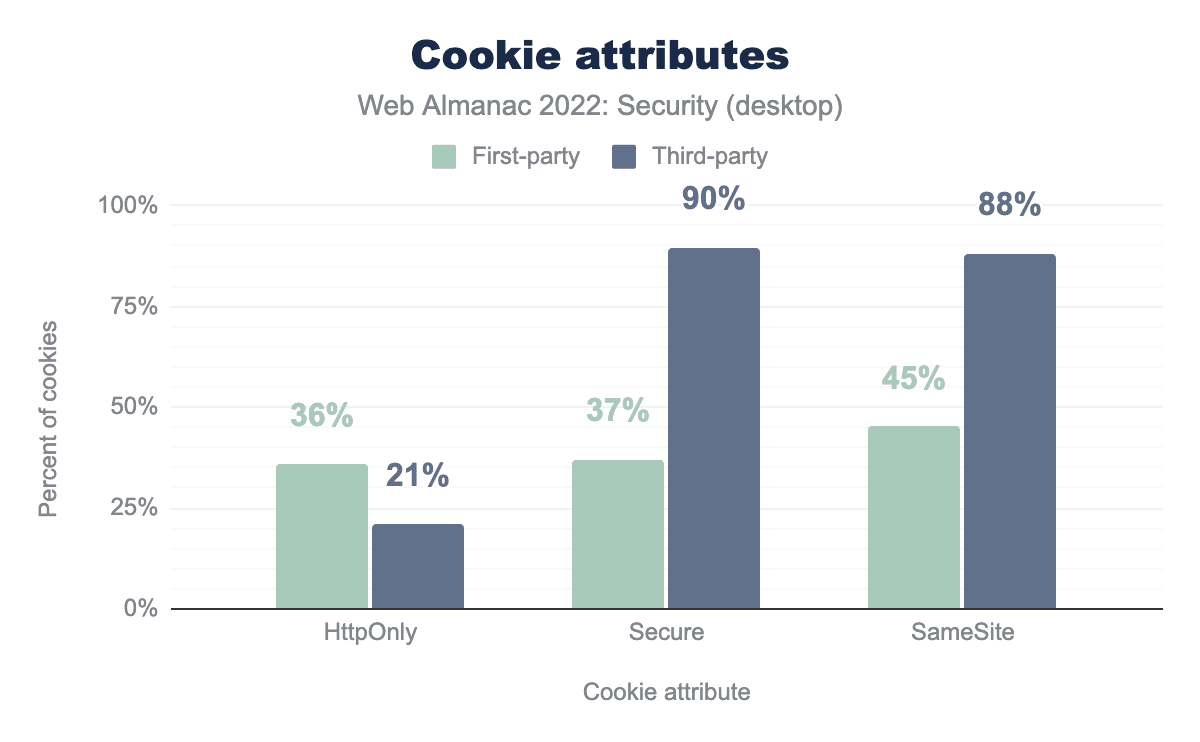 HttpOnlyが36%、Secureが37%、SameSiteが45%で使用されており、サードパーティでは、HttpOnlyが21%、Secureが90%、SameSiteが88%で使用されています。クッキーにはファーストパーティとサードパーティの2種類があります。ファーストパーティのクッキーは通常、訪問している直接のサーバーによって設定されます。サードパーティのクッキーはサードパーティのサービスによって作成され、しばしばトラッキングや広告配信に使用されます。デスクトップでのファーストパーティクッキーの37%にSecureがあり、36%にHttpOnlyが設定されています。しかし、サードパーティクッキーでは、クッキーの90%にSecureがあり、21%にHttpOnlyが設定されています。サードパーティのクッキーではHttpOnlyの割合が少ないのは、JavaScriptコードによるアクセスを許可したいためです。