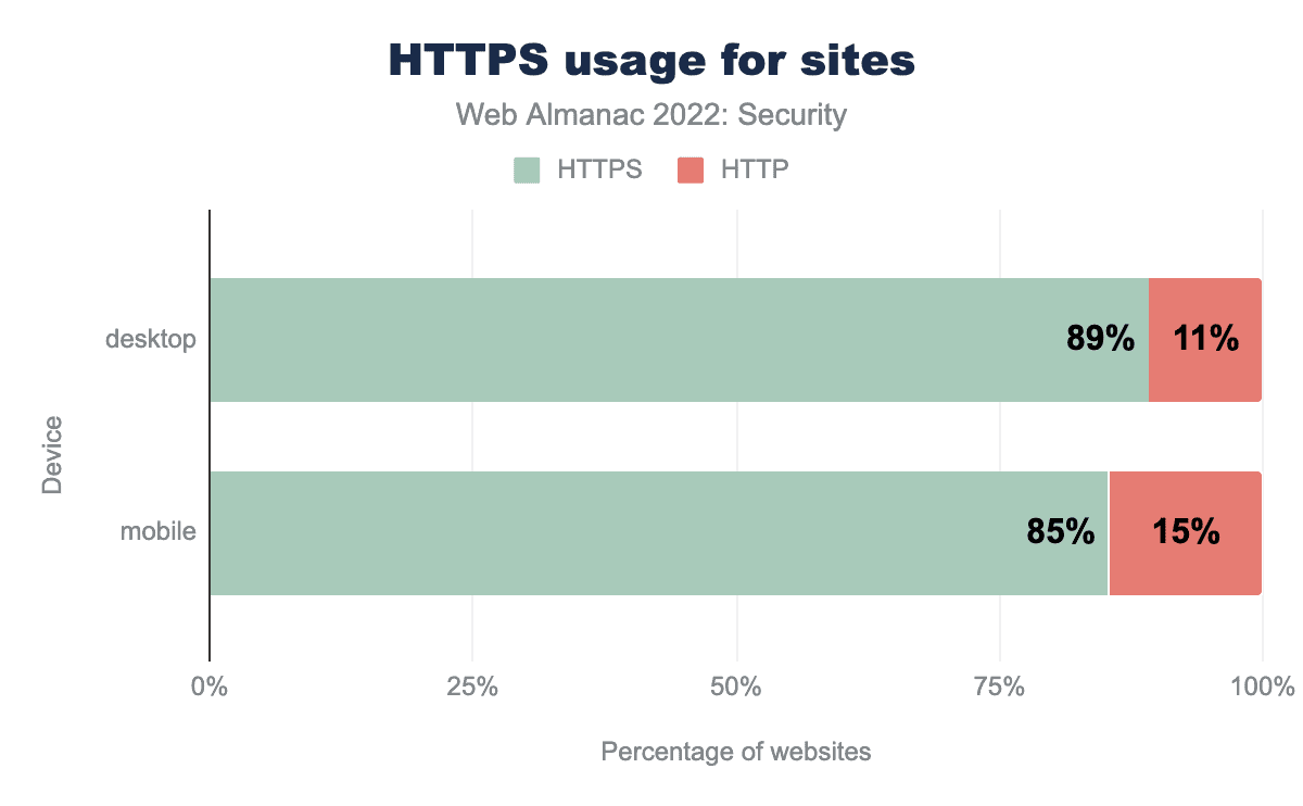 デスクトップでの総リクエストの94%、モバイルでの総リクエストの93%がHTTPS経由で行われています。すべての主要ブラウザーには、ウェブサイトがHTTPSではなくHTTPを使用している場合に警告を表示するHTTPS-only モードがあります。