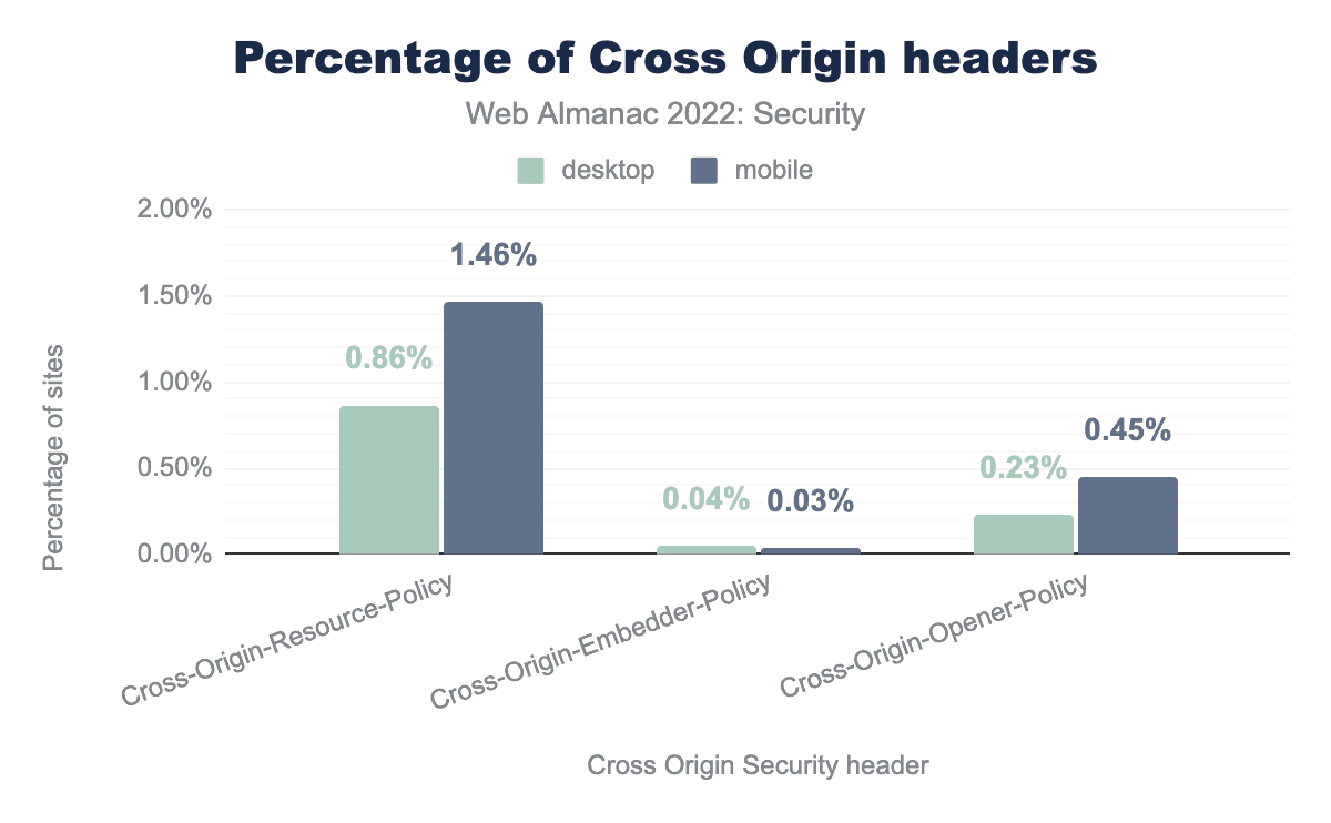 ウェブサイトのHTMLコード内で<meta>タグを使用してContent-Security-PolicyやReferrer-Policyを設定できます。たとえば、Content-Security-Policyは以下のコードを使用して設定できます: <meta http-equiv="Content-Security-Policy" content="default-src 'self'">。モバイルでこの方法でCSPとReferrer-Policyを有効にしているウェブサイトはそれぞれ0.47%と2.60%であることが分かりました。