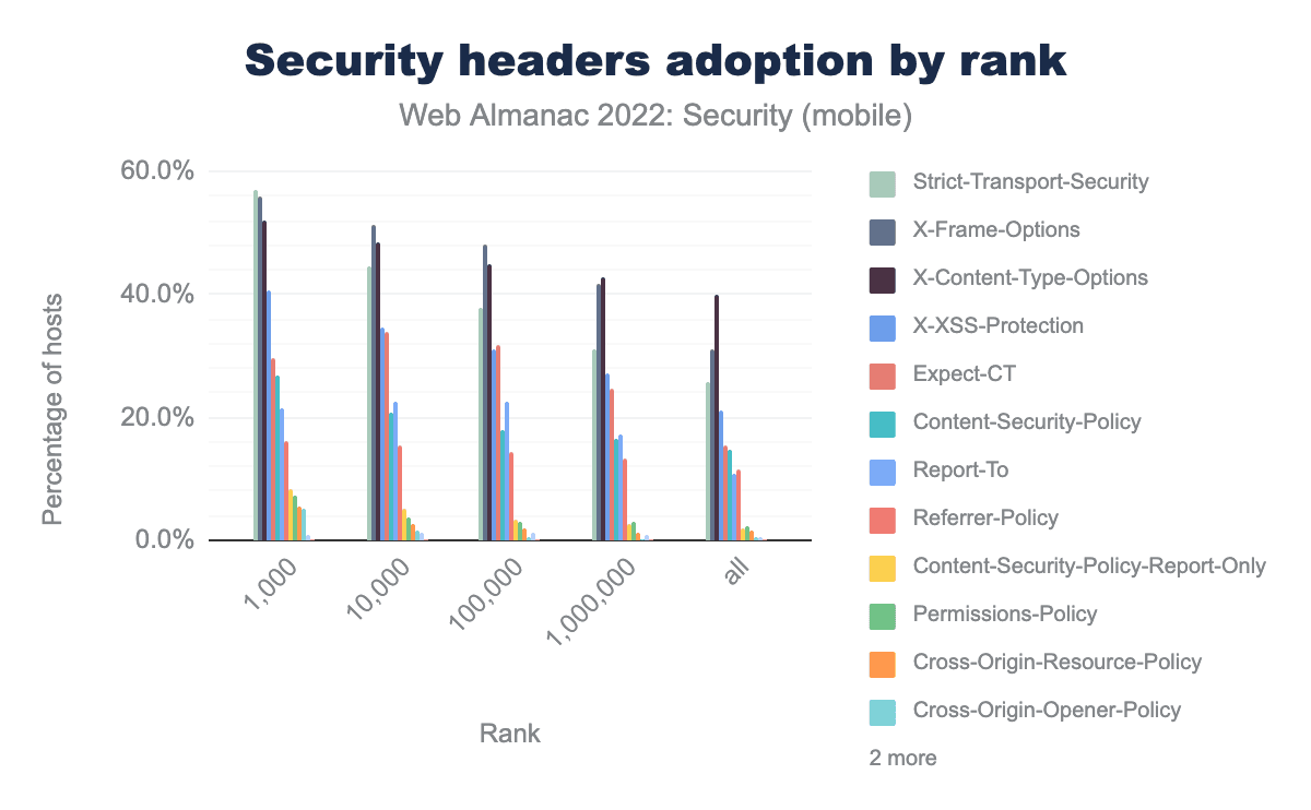 調査によると、Strict-Transport-Security、X-Frame-Options、およびX-Content-Type-Optionsは、人気のあるウェブサイトほど採用率が高いことがわかりました。モバイルのトップ1000ウェブサイトの56.8%がStrict-Transport-Securityを採用しており、これらのウェブサイトはコンテンツとデータをHTTPS経由でのみ提供することを重視しています。人気のないウェブサイトもHTTPSを有効にしているかもしれませんが、ウェブサイトが常にHTTPS経由で提供されるようにStrict-Transport-Securityヘッダーを追加することはしばしば見られません。今年の数字は昨年の結果とほぼ一致しています。