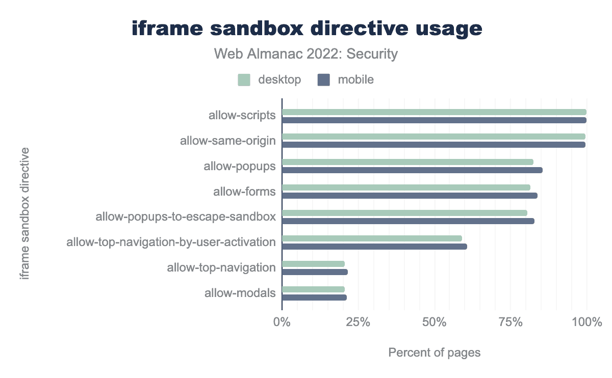 コンテンツセキュリティポリシーの完全な定義を観察すると、依然として単一のディレクティブがすべてのリクエストの大部分を占めています。すべてのデスクトップリクエストの19%が upgrade-insecure-requests のみに設定されています。8%が frame-ancestors 'self' に設定され、23%が block-all-mixed-content; frame-ancestors 'none'; upgrade-insecure-requests; の値に設定されています。これは、もっとも一般的なCSPディレクティブの上位3つを組み合わせたものです。