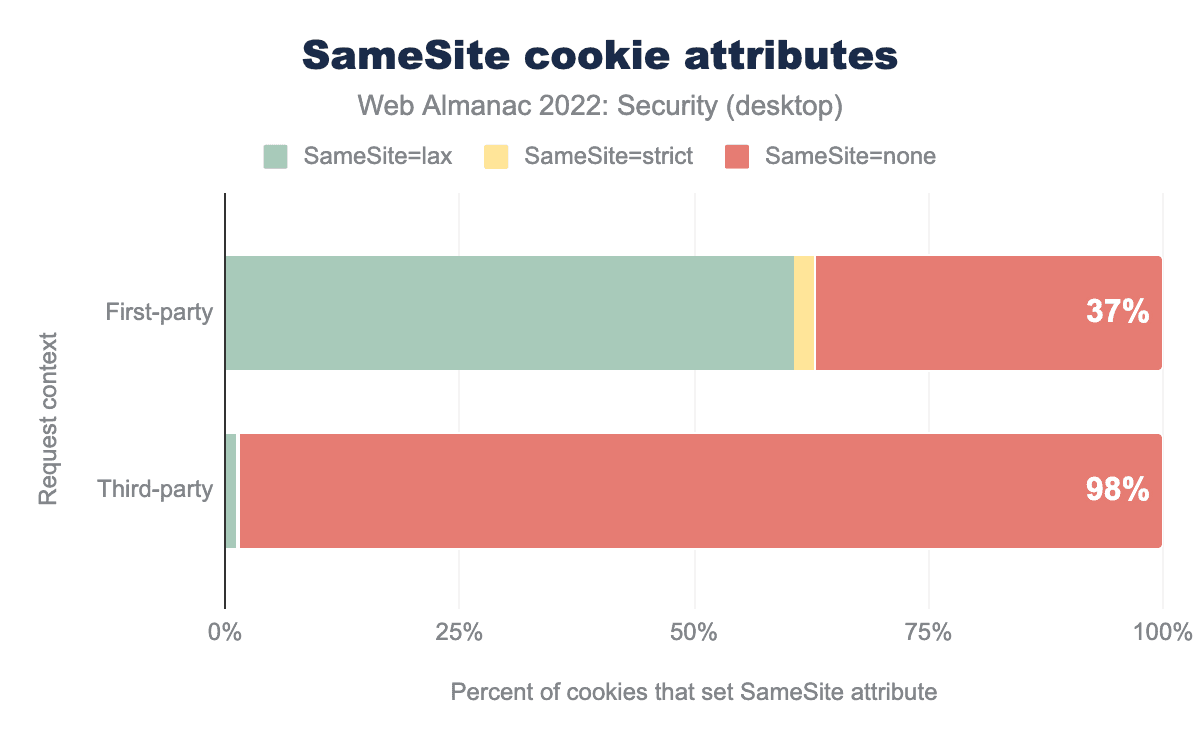 SameSite=laxが61%、SameSite=strictが2%、SameSite=noneが37%で使用されています。サードパーティではSameSite=laxが1%、SameSite=strictが1%、SameSite=noneが98%で使用されています。SameSite属性は、ブラウザにクロスサイトリクエストにクッキーを送信するかどうかを指示することで、CSRF攻撃を防ぐために使用できます。Strict値はクッキーが元々のサイトからのみ送信されることを許可し、Lax値はユーザーがリンクをたどって元のサイトにナビゲートする場合にのみ、クロスサイトリクエストにクッキーを送信することを許可します。None値の場合、クッキーは発信元とクロスサイトのリクエストの両方に送信されます。SameSite=Noneが設定されている場合、クッキーのSecure属性も設定されている必要があります(そうでない場合、クッキーはブロックされます)。SameSite属性を持つファーストパーティクッキーの61%がLax値を持っています。SameSite属性がない場合、ほとんどのブラウザはデフォルトでSameSite=Laxを使用するため、これがチャートを支配し続けるのを見ています。サードパーティのクッキーでは、SameSite=Noneがデスクトップでのクッキーの98%で非常に高いままです。これは、サードパーティのクッキーがクロスサイトリクエストで送信されたいと考えているためです。