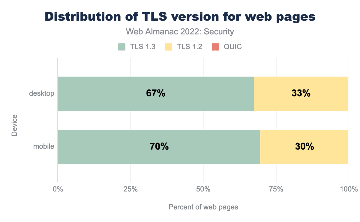 上のグラフでは、モバイルのホームページの70%、デスクトップのホームページの67%がTLSv1.3で提供されており、昨年から約7%増加しています。したがって、TLS v1.2からTLS v1.3への一定のシフトが見られます。
