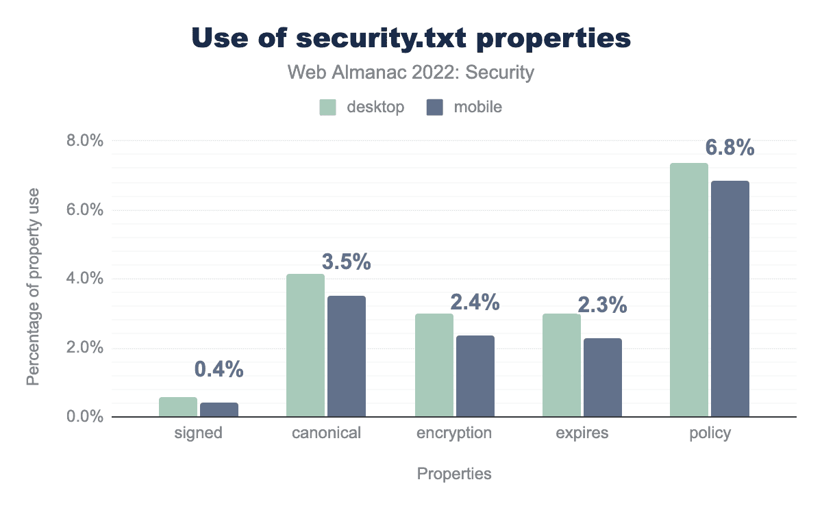 security.txtの異なるプロパティの使用を示す棒グラフ。デスクトップでは0.6%、モバイルでは0.4%のsecurity.txtファイルが署名されています。Canonicalはデスクトップで4.2%、モバイルで3.5%で使用されています。Encryptionはデスクトップで3.0%、モバイルで2.4%です。Expiresはデスクトップで3.0%、モバイルで2.3%です。Policyはデスクトップで7.3%、モバイルで6.8%です。今年はsecurity.txt URIのexpiresプロパティを持つ割合が0.7%から2.3%に増加しました。expiresプロパティは標準に基づいて必要なプロパティであるため、より多くのウェブサイトが標準にしたがっているのを見るのは良いことです。policyはsecurity.txt URIでもっとも人気のあるプロパティのままです。policyは、セキュリティ研究者が脆弱性を報告するために従うべき手順を説明しているため、security.txt URIにとって非常に重要です。