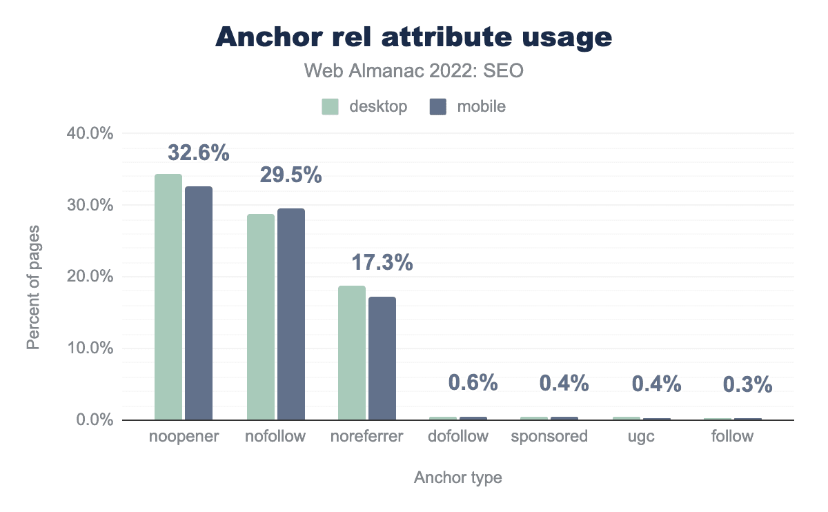 実際の属性である rel="nofollow" は、2022年にはモバイルページの29.5%で見つかり、昨年より1.2%減少しました。Googleはnofollowをヒントとして扱い、検索エンジンがその属性を尊重するかどうかを選択できることを意味します。
