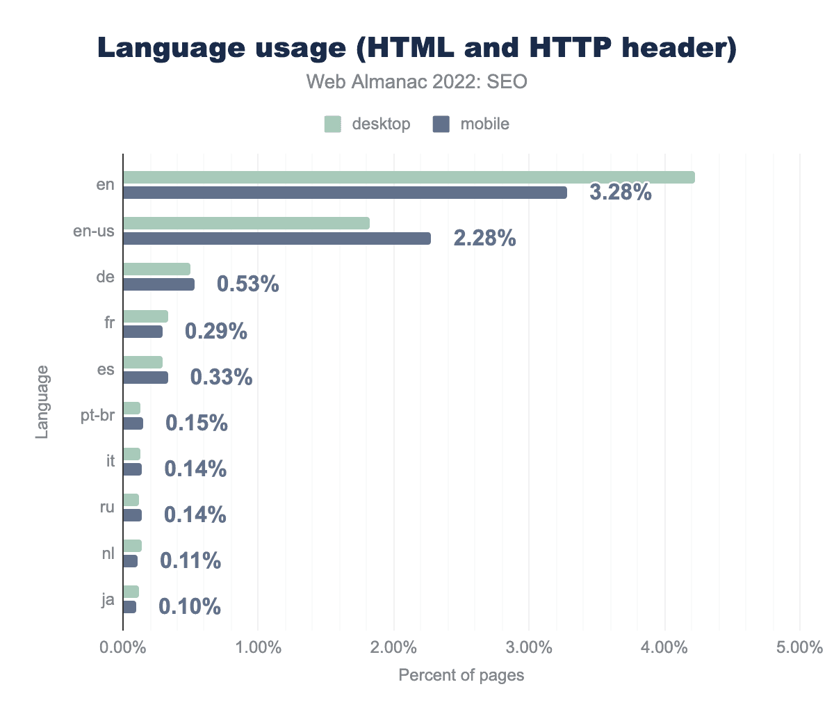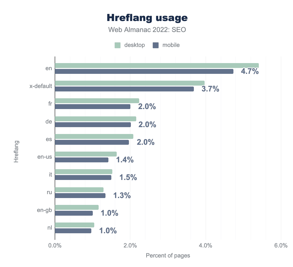 2022年にもっとも普及しているhreflangタグはen[English]で、デスクトップで5.4%、モバイルで4.7%となっています。この割合は前年とほぼ同じです。