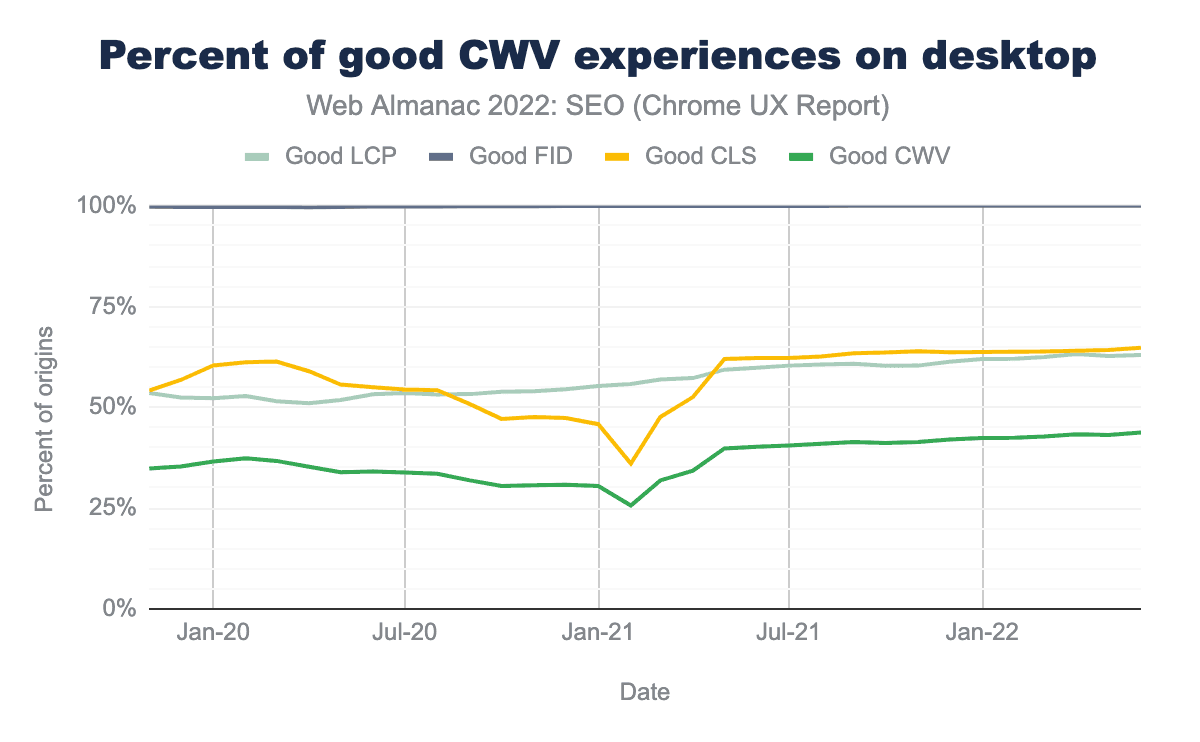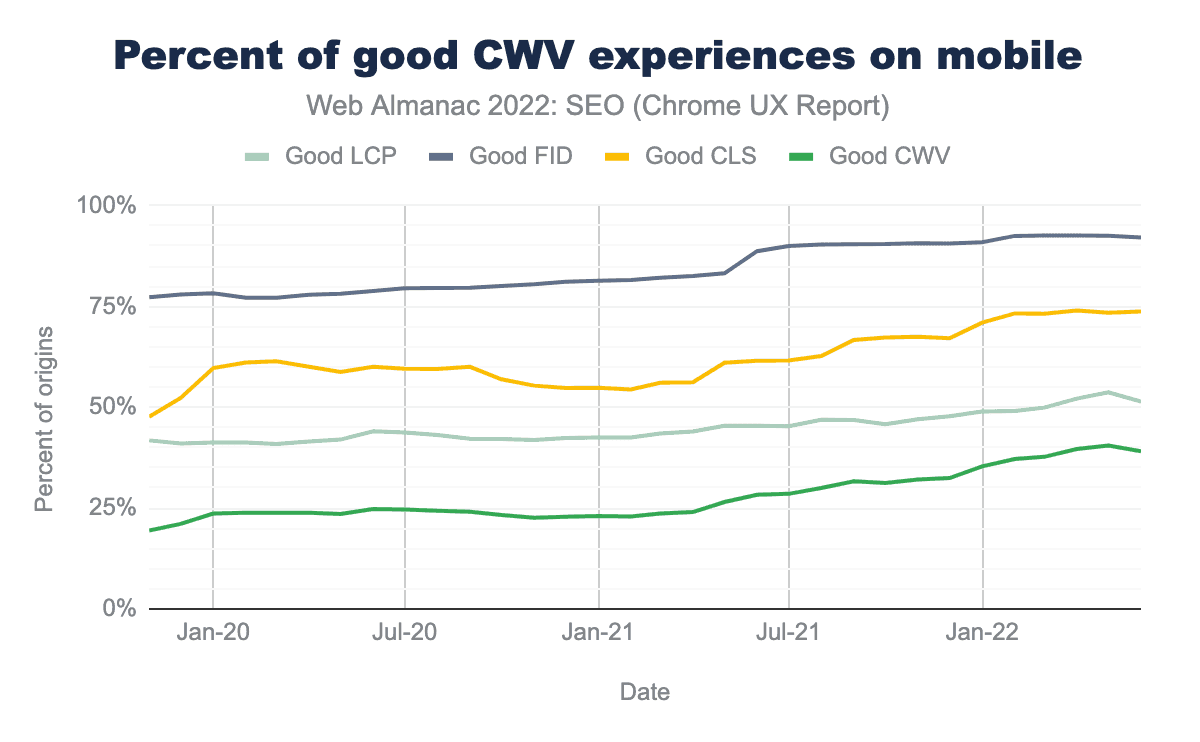 モバイルでは、現在39%のサイトがCWVに合格しており、2021年の29%、2020年のわずか20%から上昇しています。また、現在92%のサイトがFIDに合格していますが、もっとも多くのサイトオーナーはLCPに苦戦しており、合格率は51%です。