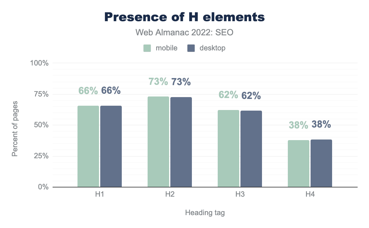 もう1つの傾向は、h1とh2の使い方の違いです。デスクトップページの72.7%がh2を使用しているのに対し、h1を使用しているのは65.8%のみです(モバイルでも同様の数字が反映されています)。