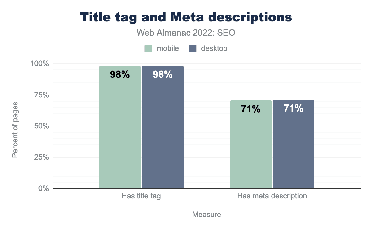 2年連続で、デスクトップとモバイルページの98.8%に<title>要素がありました。また、2022年には、デスクトップとモバイルのホームページの71%に<meta name="description">タグがあり、昨年より0.1%減少しました。