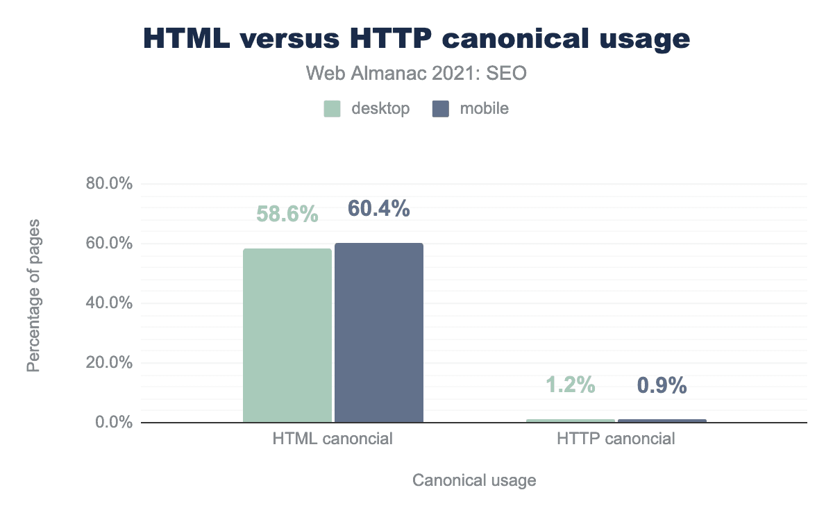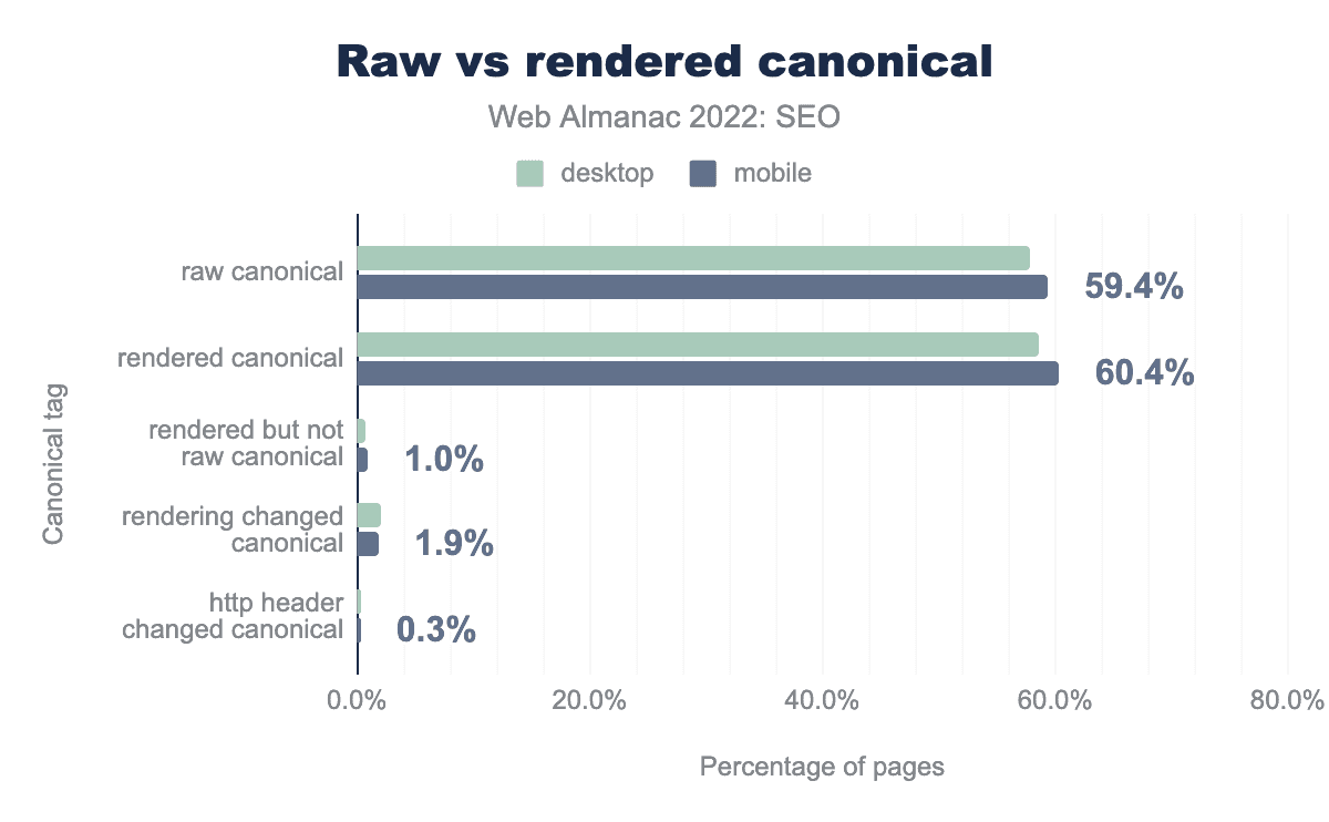 2021年の未加工のcanonical使用率は57.7%、レンダリングされたcanonical使用率は58.4%であったのに対し、2022年には若干の成長が見られ、未加工のcanonical使用率は59.4%、レンダリングされたcanonical使用率は60.4%に上昇しました。これは、カノニカルの使用率全体の伸びと相関しています。