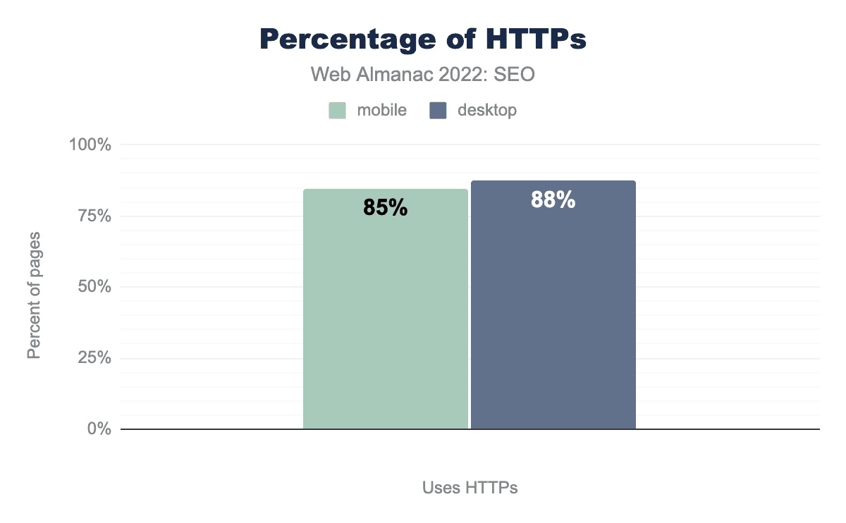 データから、より多くのサイトがクロール時に安全な証明書(HTTPS)を使用していることがわかります(これらの証明書の有効期限を考慮)。2021年にはデスクトップページの84.3%がHTTPを使用していましたが、2022年には87.71%に上昇しました。モバイルでは、2021年の81.2%から2022年には84.75%に増加しました。2020年のコアウェブバイタル更新の発表から現在まで、モバイルでは約11%、デスクトップでは10%増加しています。