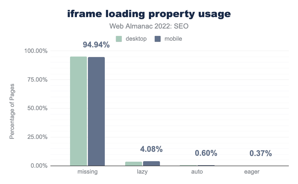 iframeのブラウザレベルの遅延読み込みがChromeで標準化されたので、これはとくに興味深いことです。lazyやeagerを指定せずにloading属性を標準化したことが、94.4%の属性がlazyやeagerを含んでいないというデータを示している理由でしょう。