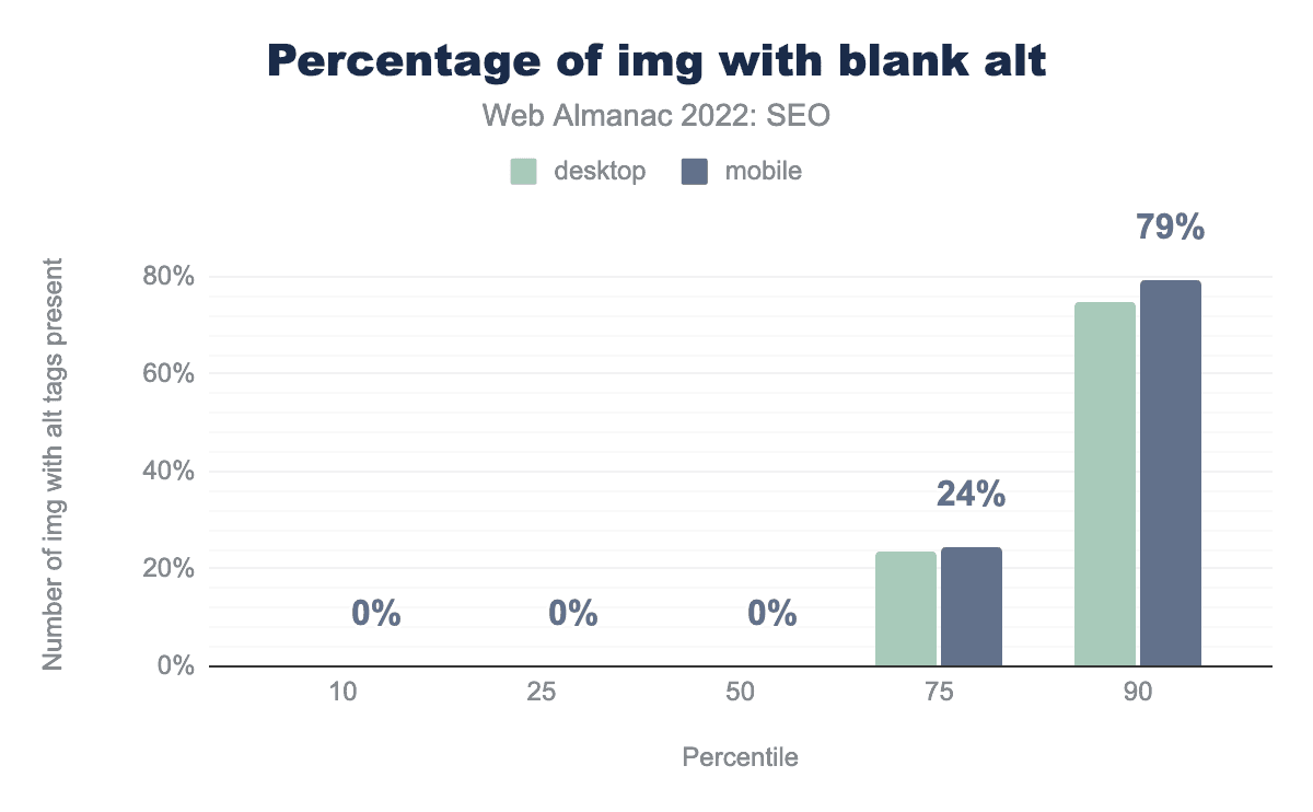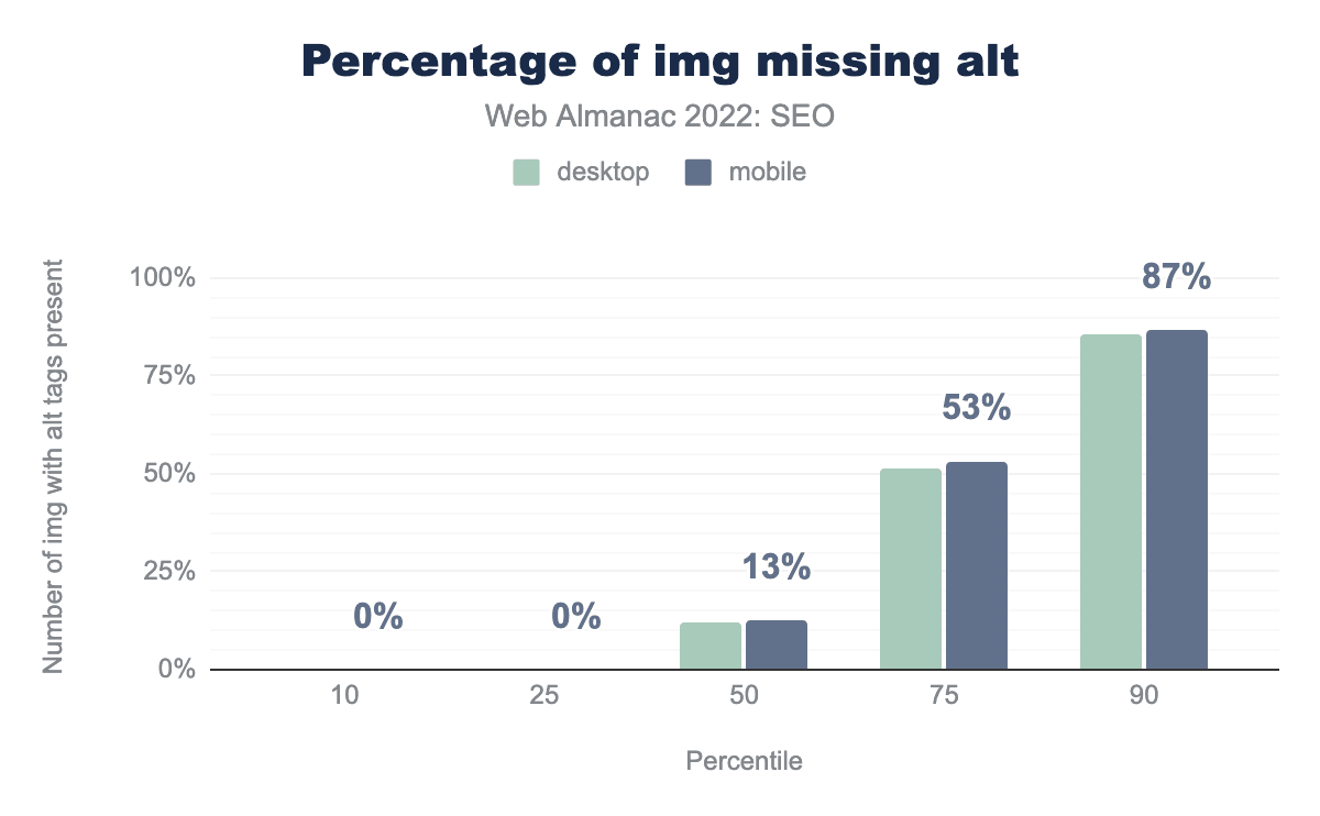 <img>タグを含むデスクトップとモバイルページの中央値は、2021年と比較して顕著な変化が見られます。昨年、デスクトップ ページとモバイル ページの中央値には、それぞれ10.5%と11.8%の<img>タグと空白のalt属性が含まれていました。2022年には、この数字はデスクトップで12.1%、モバイルで12.5%に上昇。 - alt属性がない