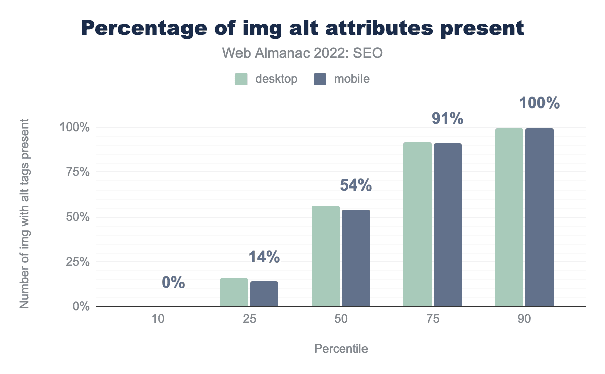 <img>タグの56.25%がalt属性を持っています。これは、2021年の56.5%からわずか4分の1ポイントのごくわずかな減少です。 - モバイルページの中央値では、