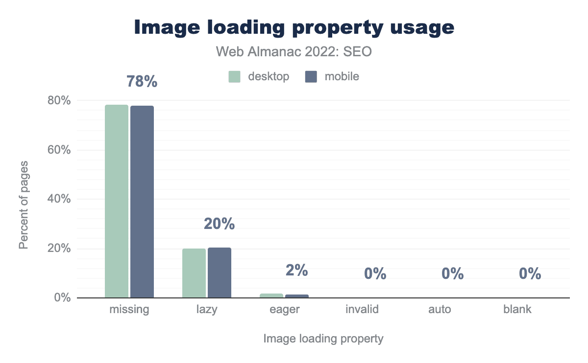 - 画像読み込みプロパティを使用しないページが大幅に減少しています。2021年には、デスクトップページの83.3%、モバイルページの83.5%が画像読み込みプロパティをまったく利用していませんでした。2022年には、デスクトップページの78.3%、モバイルページの77.9%となっています。