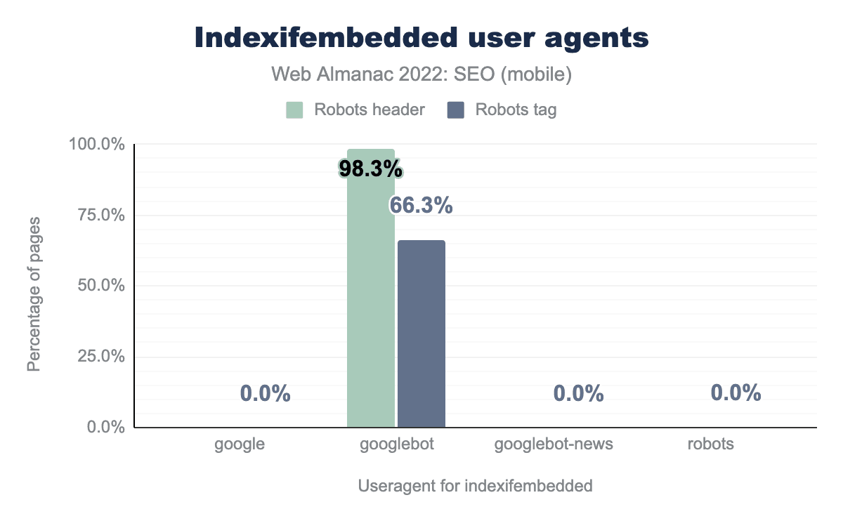 indexifembeddedの実装の大部分がrobotsヘッダーを98.3%使用しており、googlebotユーザーエージェントをターゲットにしていることを示す棒グラフです。他の3つのユーザーエージェント(google、gogglebot-news、robots)の使用率は0%です。Indexifembeddedユーザーエージェント。
