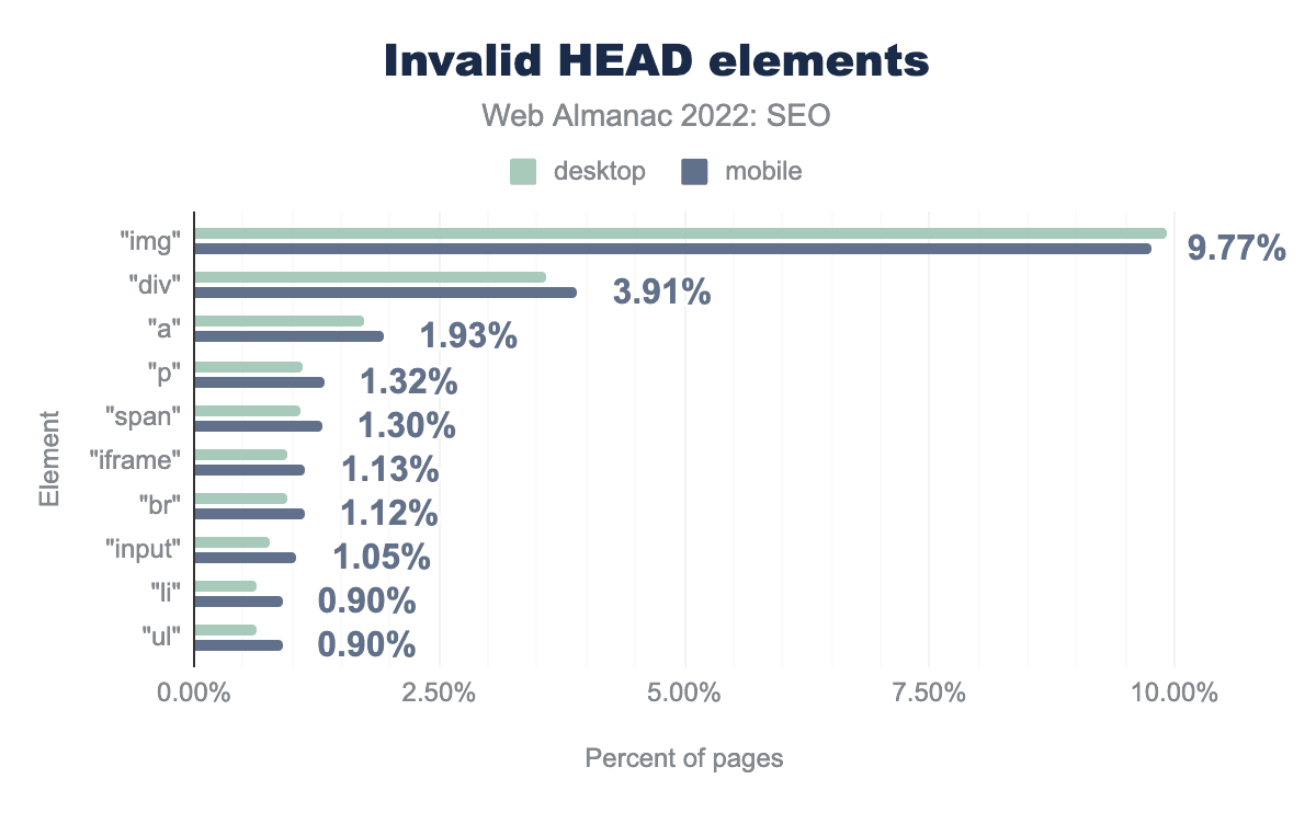 <head>の中に無効なHTML要素が含まれているページの割合。デスクトップでは、imgが9.92%、divが3.58%、aが1.73%、pが1.11%、spanが1.08%、iframeが0.96%、brが0.94%、inputが0.78%、liが0.63%、そして最後にulが0.63%のページで使用されています。モバイルはそれぞれ9.77%、3.91%、1.93%、1.32%、1.30%、1.13%、1.12%、1.05%、0.90%、0.90%と非常に似ています。<head> 要素です。