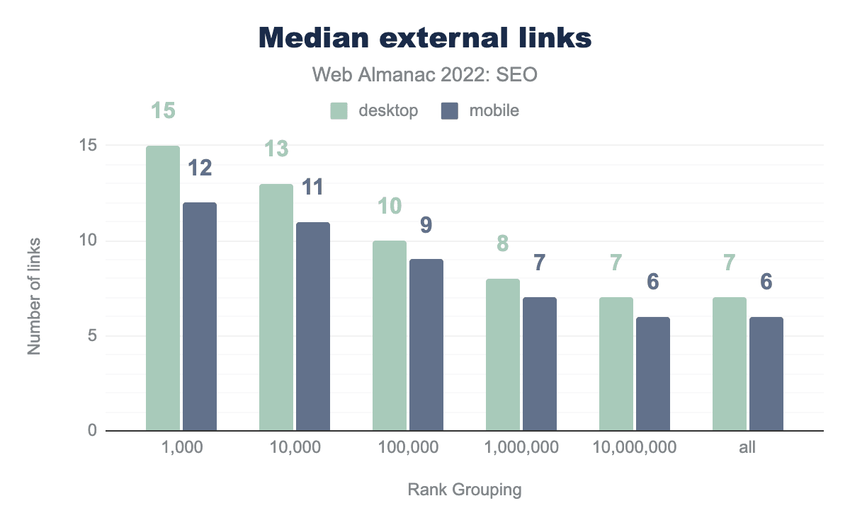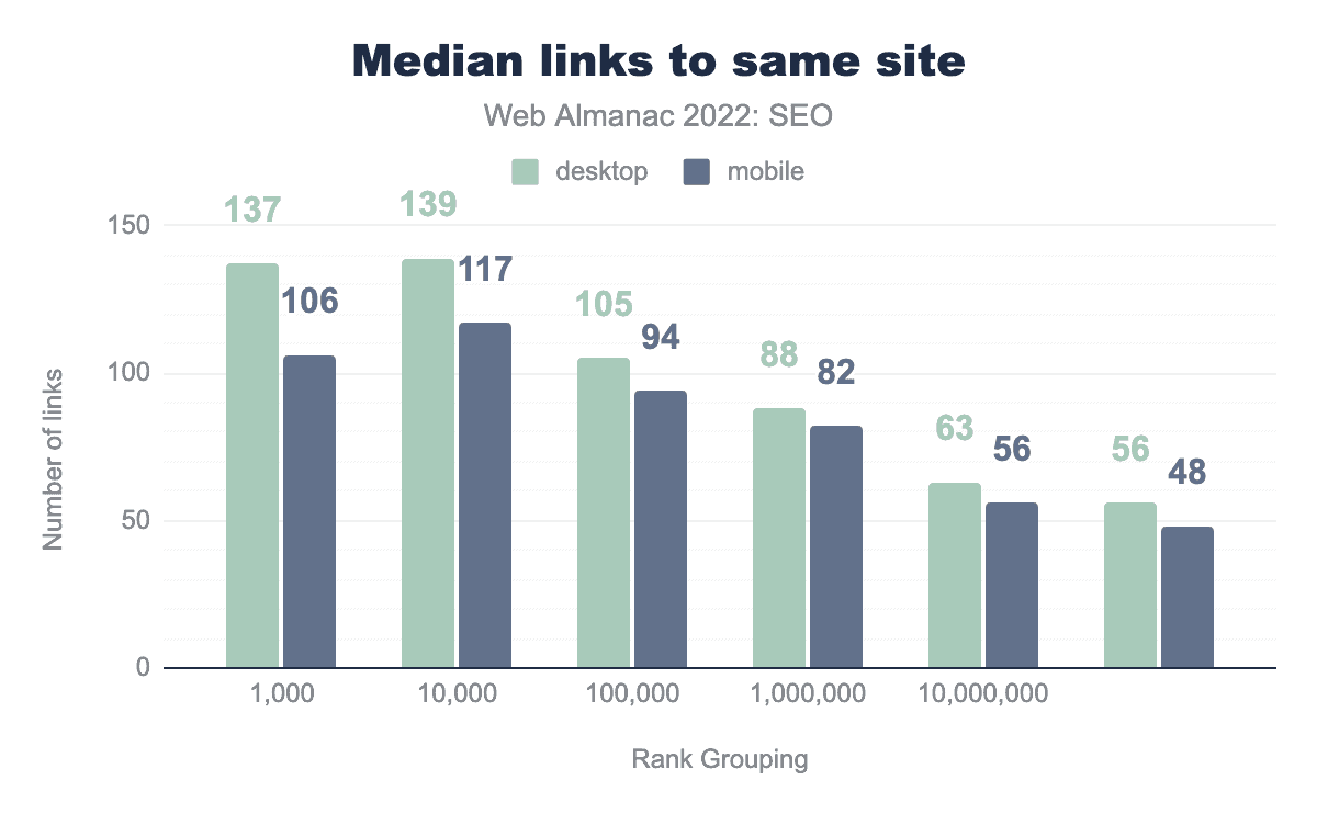 内部リンクとは、同じウェブサイトの他のページへのリンクのことです。昨年と同様、2022年の数字も、デスクトップ版に比べてモバイル版のリンク数が少ないことを示唆しています。