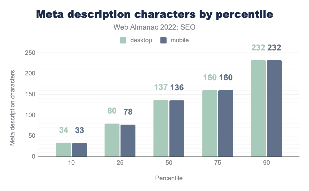 <meta name="description>タグに含まれる文字数の中央値は、それぞれ137文字と136文字でした。 - デスクトップとモバイルのページの10%に、35語を含む
