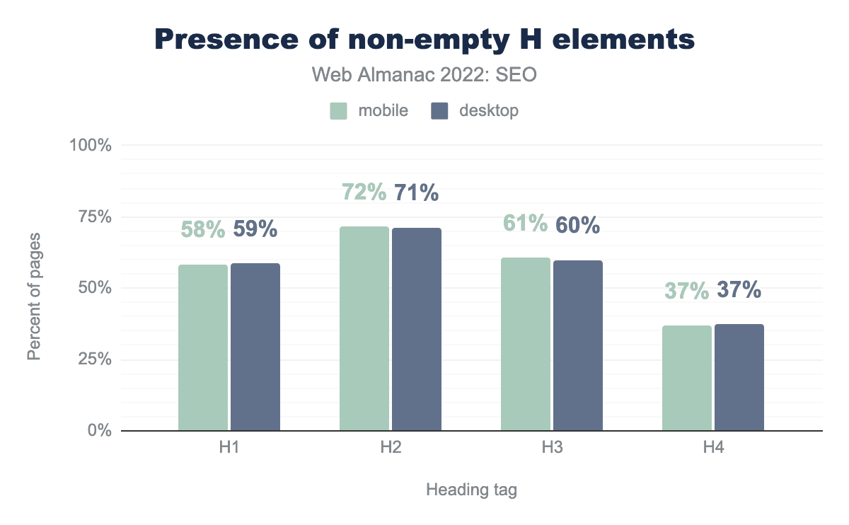 全体的に、2021年の統計と同様に、ページ上に空のH要素は比較的少ないことがわかります。さらに、デスクトップとモバイルのデータにはほとんど食い違いがありません。