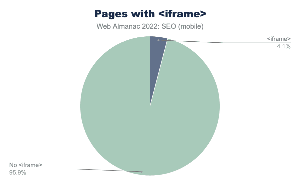 ページの4%強が <iframe> 要素を含んでいます。 この要素を含むページの4.1%のうち、76%はiframeがnoindexされており、新しいindexifembeddedタグの潜在的な使用例となっています。