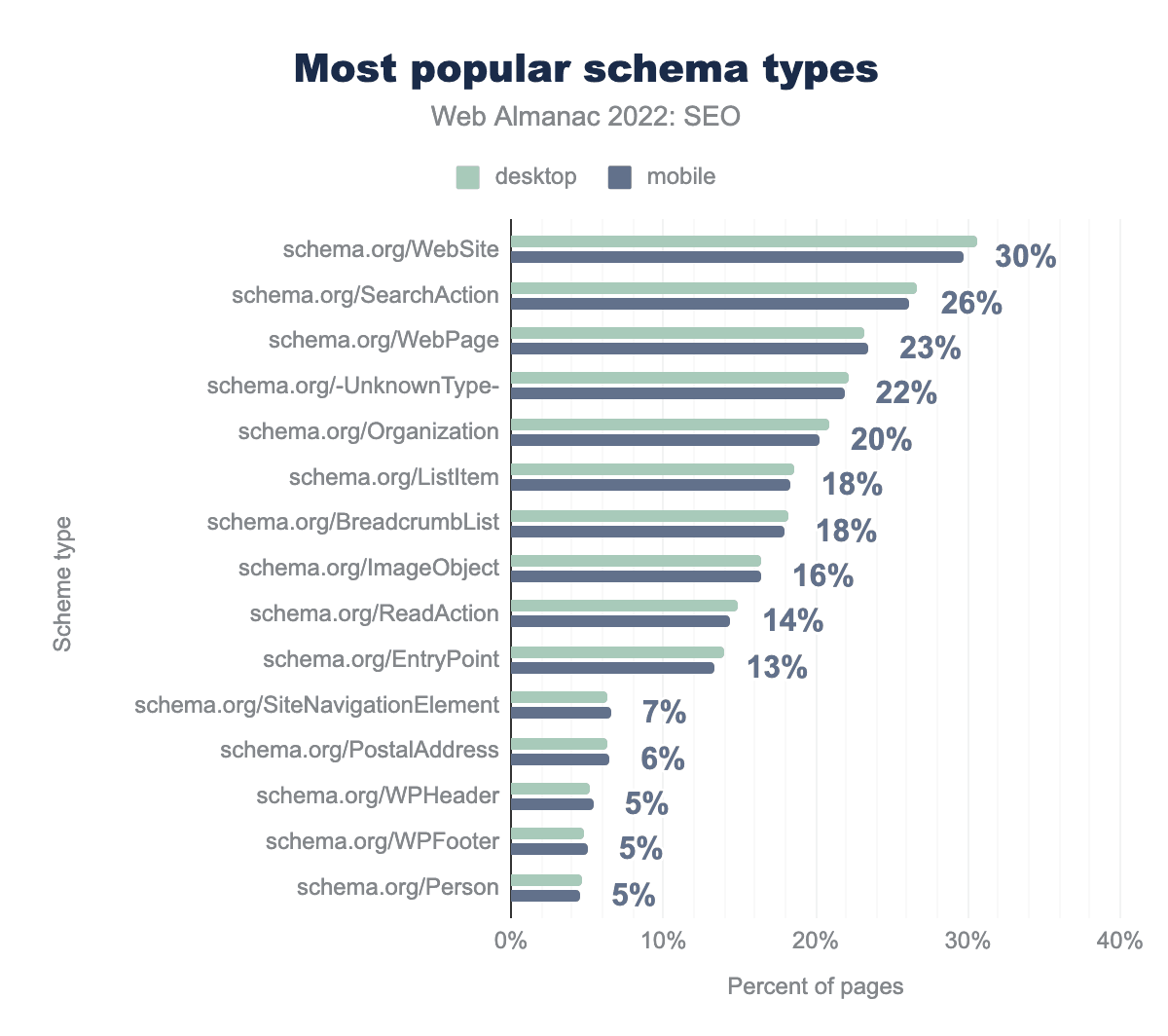 schema.org/WebSiteはデスクトップページの31%、schema.org/SearchActionは27%、schema.org/WebPageは23%、schema.org/UnknownType-は22%、schema.org/Organizationは21%、schema.org/ListItemは19%、schema.org/BreadcrumbListは18%、schema. schema.org/ImageObjectが16%、schema.org/ReadActionが15%、schema.org/EntryPointが14%、schema.org/SiteNavigationElementが6%、schema.org/PostalAddressが6%、schema.org/WPHeaderが5%、schema.org/WPFooterが5%、そして最後にschema.org/Personがデスクトップページの5%です。モバイルもほぼ同じで、それぞれ30%、26%、23%、22%、20%、18%、16%、14%、13%、7%、6%、5%、5%、5%です。2021年と2022年のホームページでもっとも普及しているスキーマの種類には強い相関関係があります。
