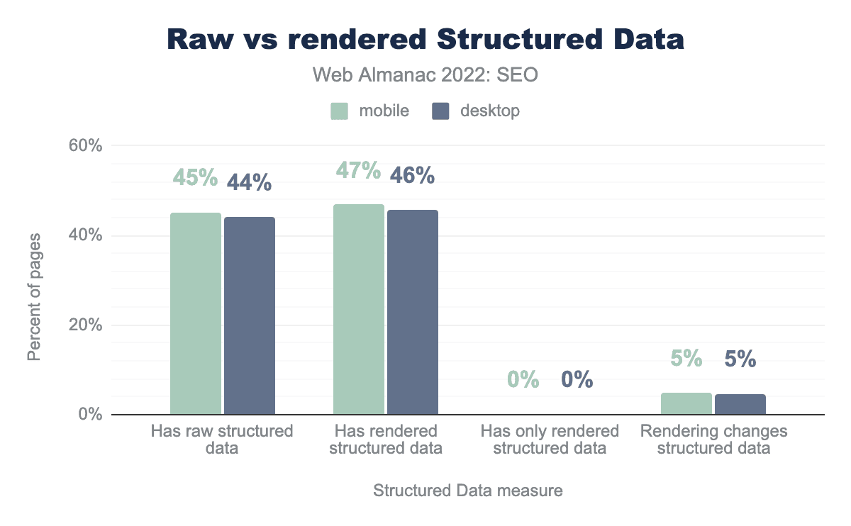 これは、デスクトップとモバイルページの両方で2ポイントの増加を反映しています。多くのコンテンツ管理システムがページに自動構造化データマークアップを追加したことと、前述のように構造化データがGoogle SERPsで重要な役割を果たすようになったことの2つが、採用増加の理由として考えられます。