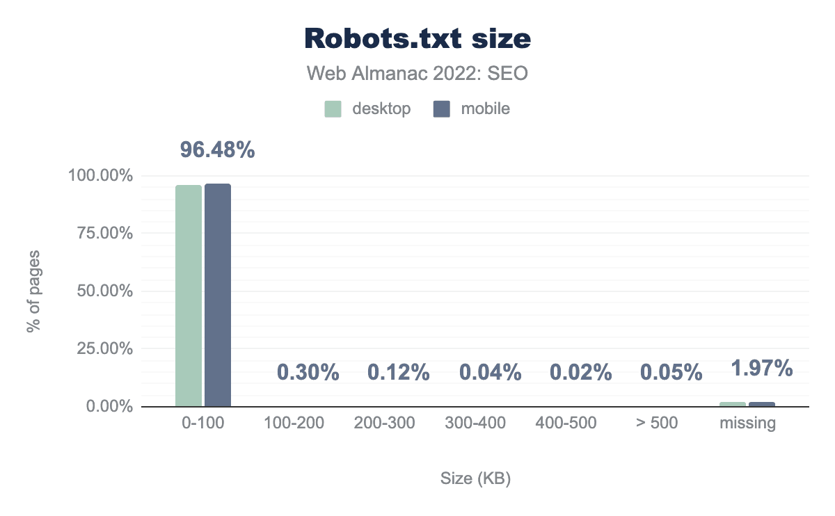 Googleのrobots.txtファイルの上限は500KiBです。ファイルがこの制限に達した後に見つかったディレクティブは、検索エンジンによって無視されます。このカテゴリーに分類されるrobots.txtファイルはごく少数です。とくに、デスクトップとモバイルの両方のサイトのわずか0.005%が、Googleの最大制限を超えるrobots.txtファイルを含んでいます(これは2021年のデータと一致しています)。ファイルサイズが制限を超える場合、Googleはディレクティブを統合することを推奨しています。