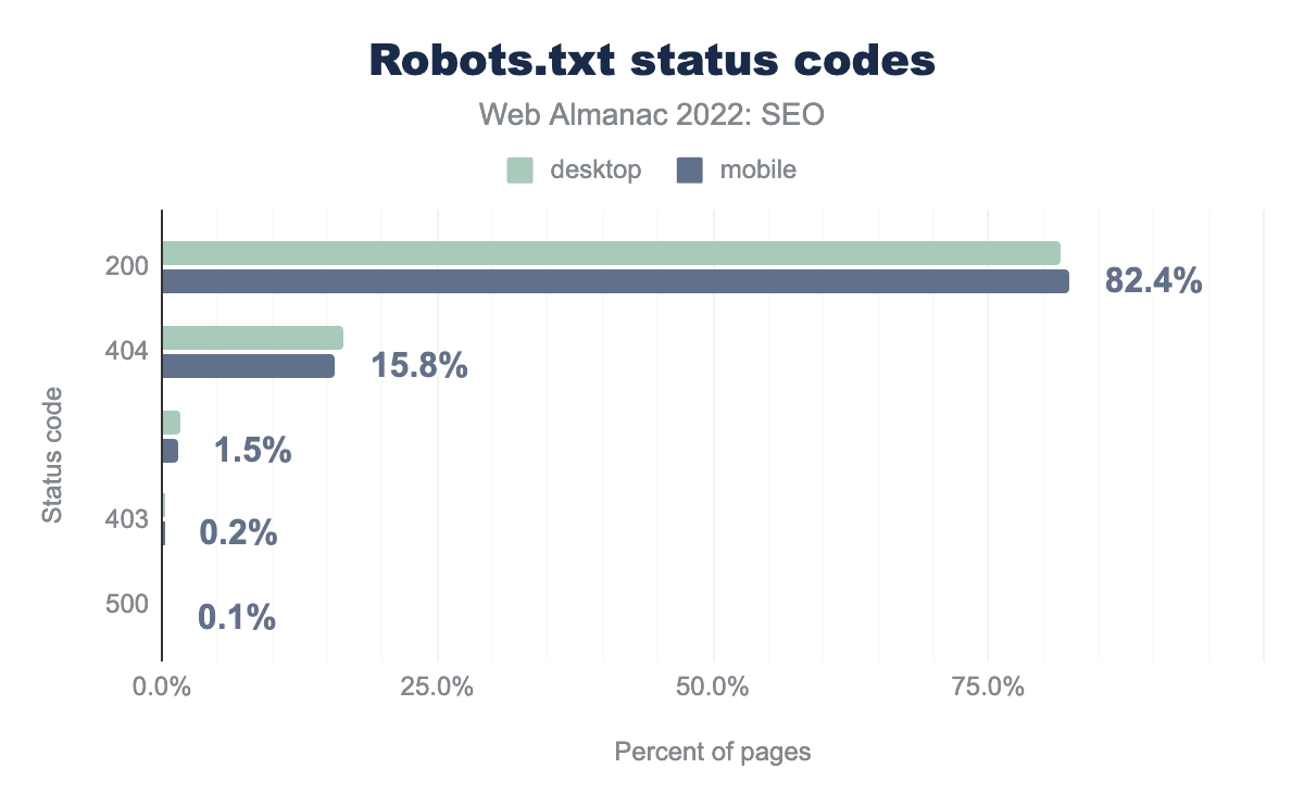 同時に、2022年には、404ステータスコードを返すrobots.txtファイルの割合が、2021年に比べてわずかに減少しました。昨年は、デスクトップサイトのrobots.txtファイルの17.3%が404を返し、モバイルサイトのrobots.txtファイルの16.5%が404を返していました。2022年、404ステータスコードを返すのは、デスクトップサイトのrobots.txtファイルの16.5%、モバイルサイトのrobots.txtファイルの15.8%です。